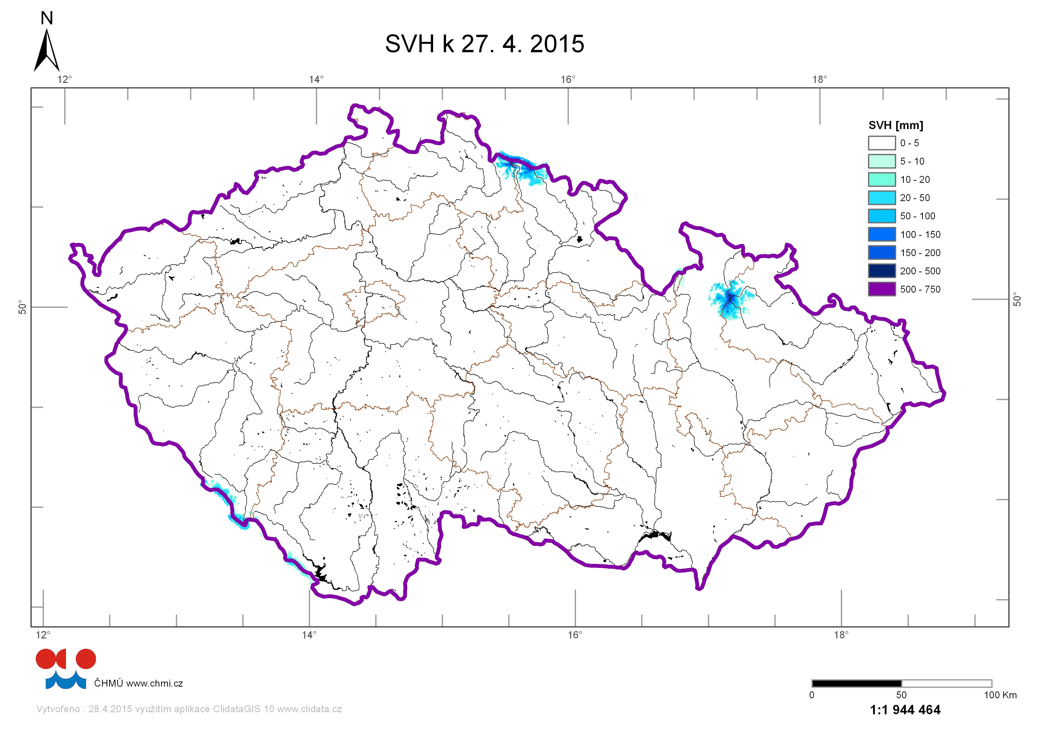 Odhad celkového množství sněhových zásob na území ČR k 27. 4. 2015 se oproti minulému týdnu výrazně snížil a činí cca 0,03 miliardy m3, což představuje v průměru cca 0,4 mm (0,4 litrů na jeden metr čtvereční).