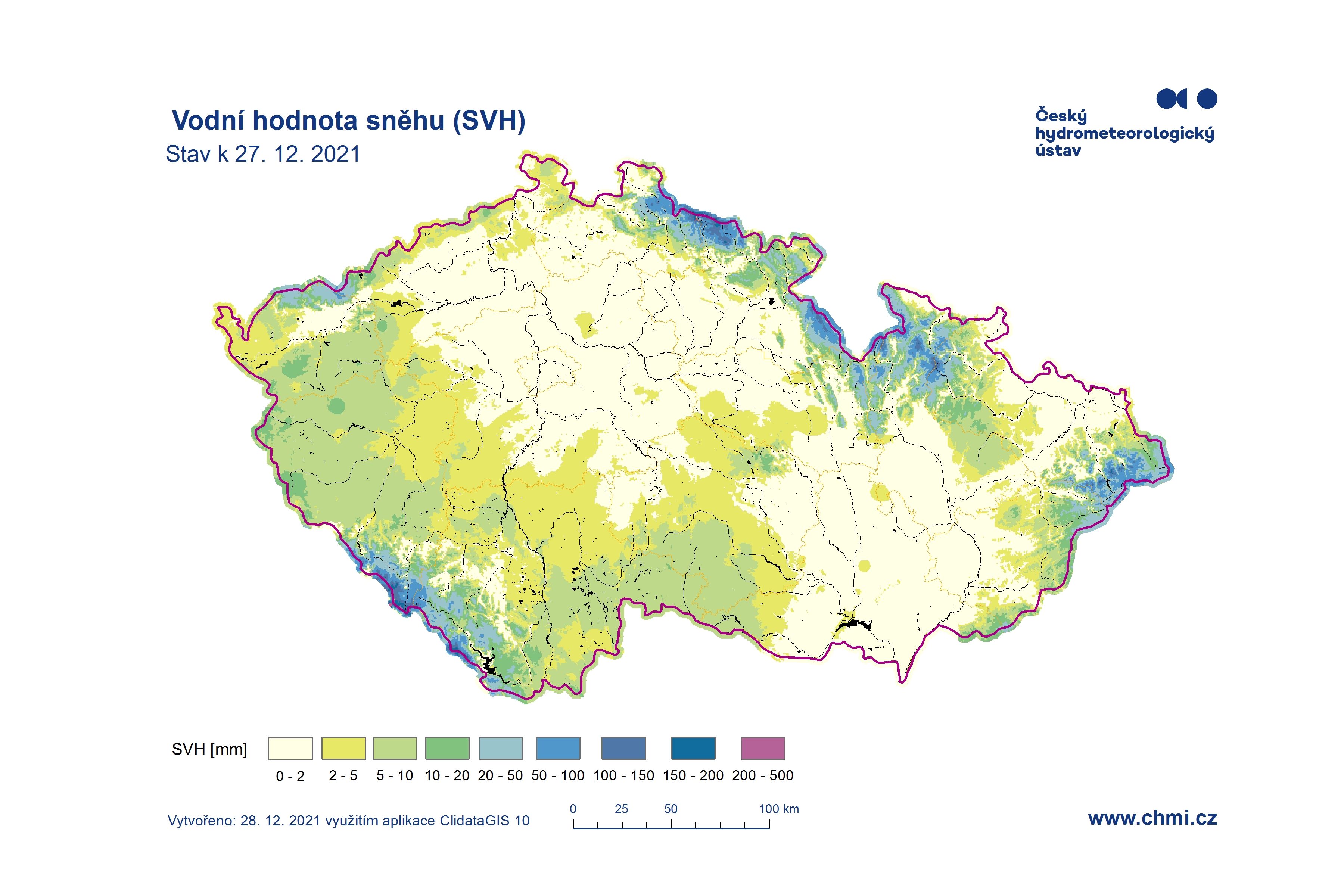 Odhad celkového množství vody ve sněhové pokrývce na území ČR k 27. 12. 2021 činí cca 0,481 mld. m3, což představuje v průměru cca 6,1 mm (6,1 litru na jeden metr čtvereční).