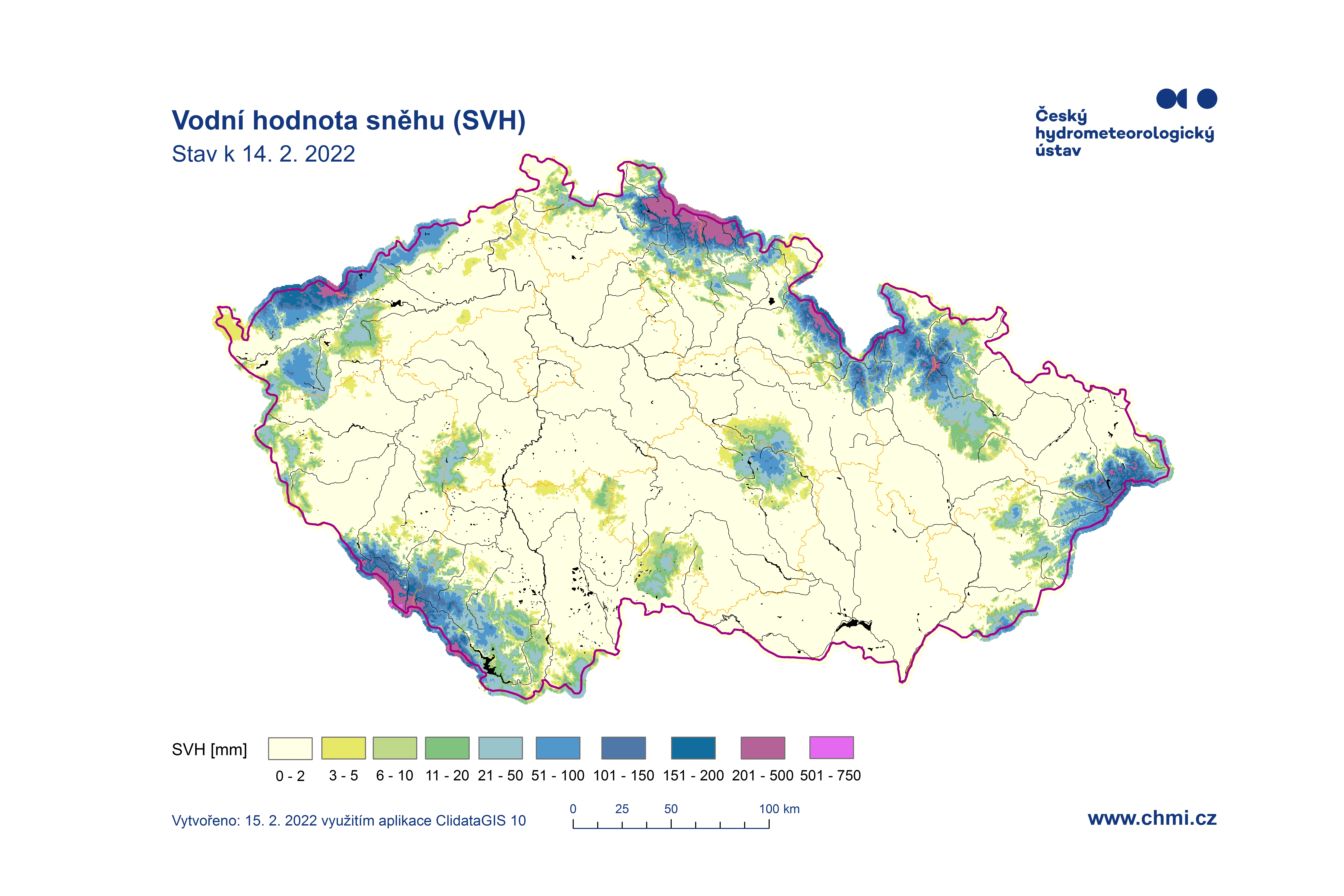 Odhad celkového množství vody ve sněhové pokrývce na území ČR k 14. 2. 2022 činí cca 0,994 mld. m3, což představuje v průměru cca 12,6 mm (12,6 litru na jeden metr čtvereční).