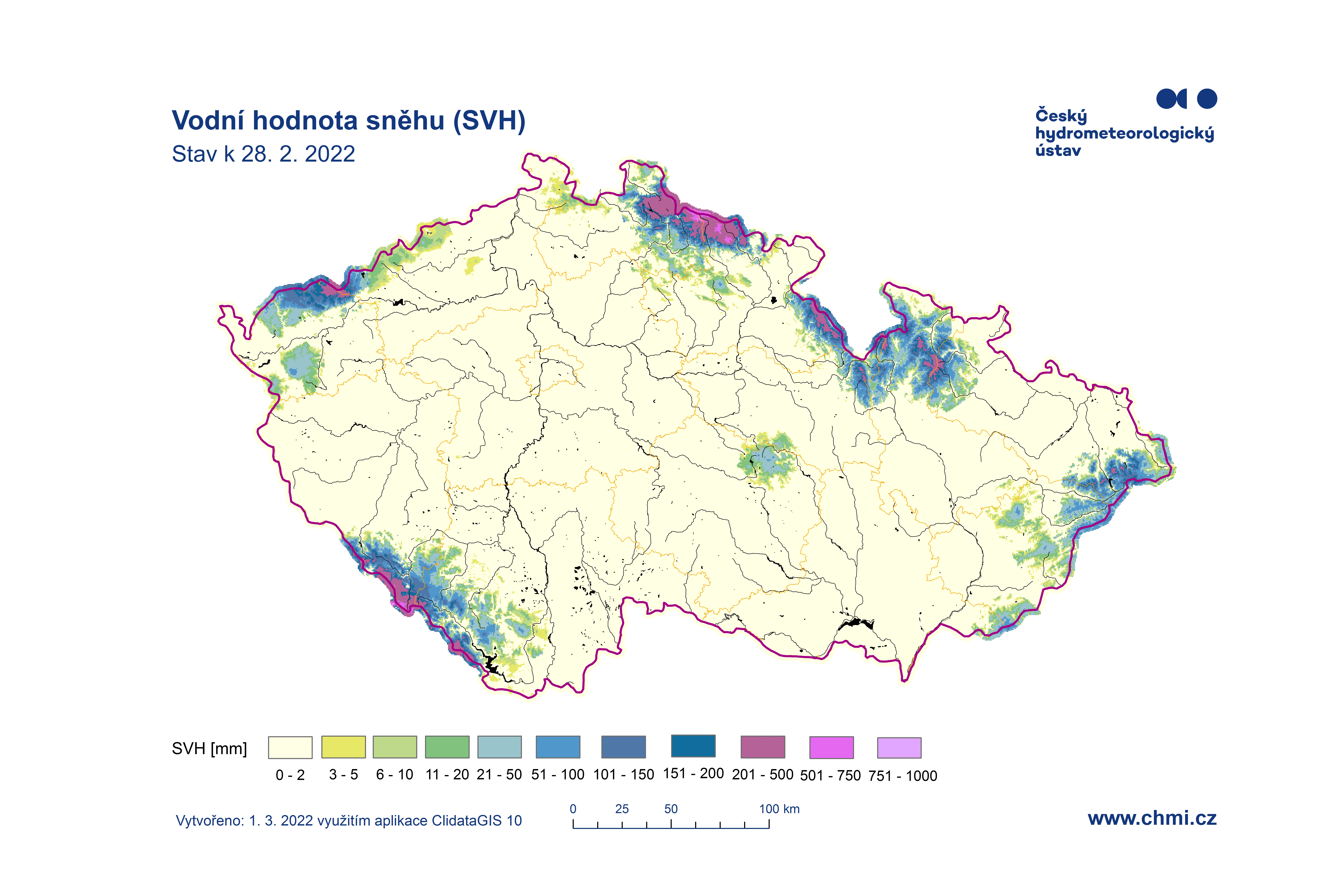 Odhad celkového množství vody ve sněhové pokrývce na území ČR k 28. 2. 2022 činí cca 0,765 mld. m3, což představuje v průměru cca 9,7 mm (9,7 litru na jeden metr čtvereční).