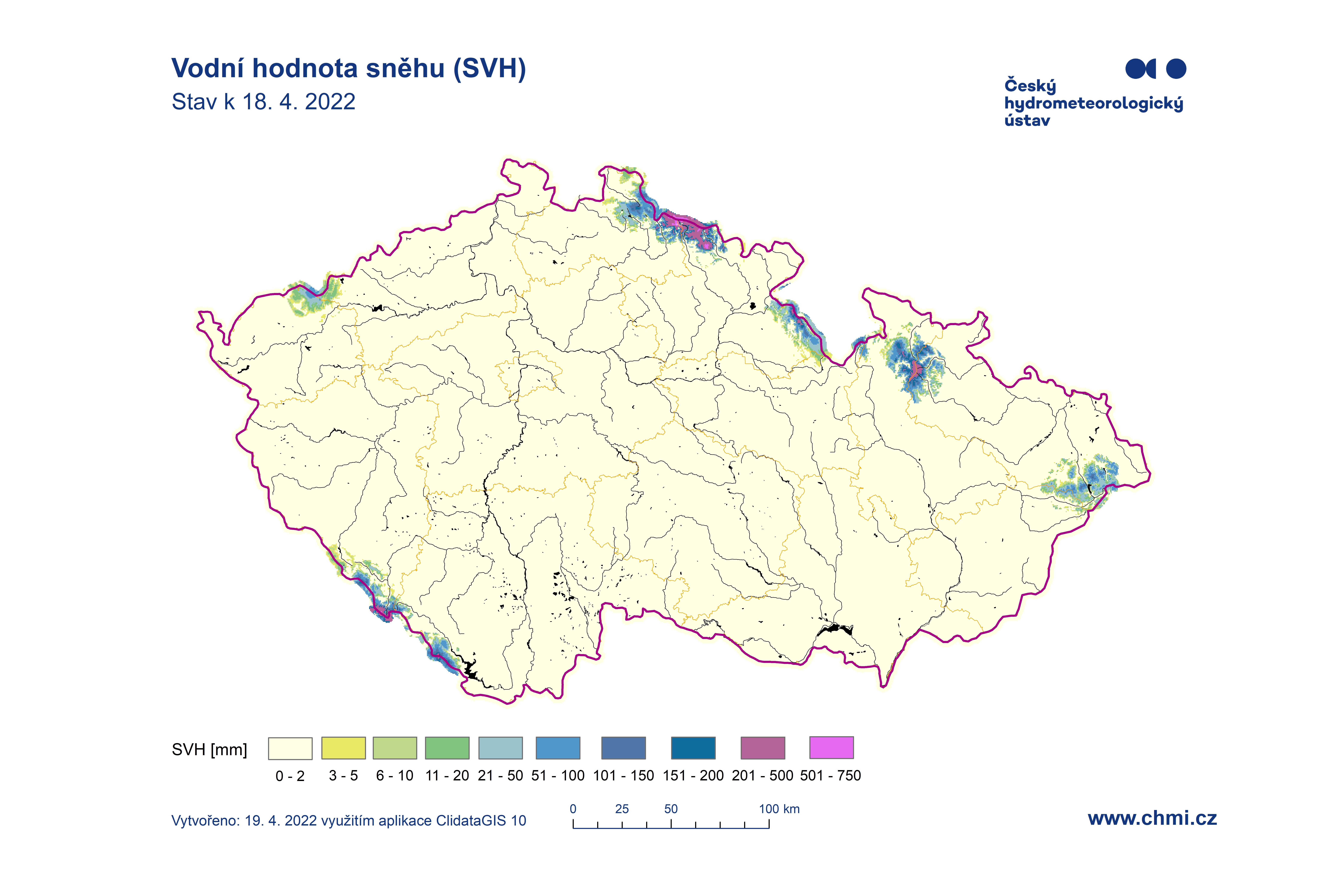Odhad celkového množství vody ve sněhové pokrývce na území ČR k 18. 4. 2022 činí cca 0,189 mld. m3, což představuje v průměru cca 2,4 (2,4 litru na jeden metr čtvereční).