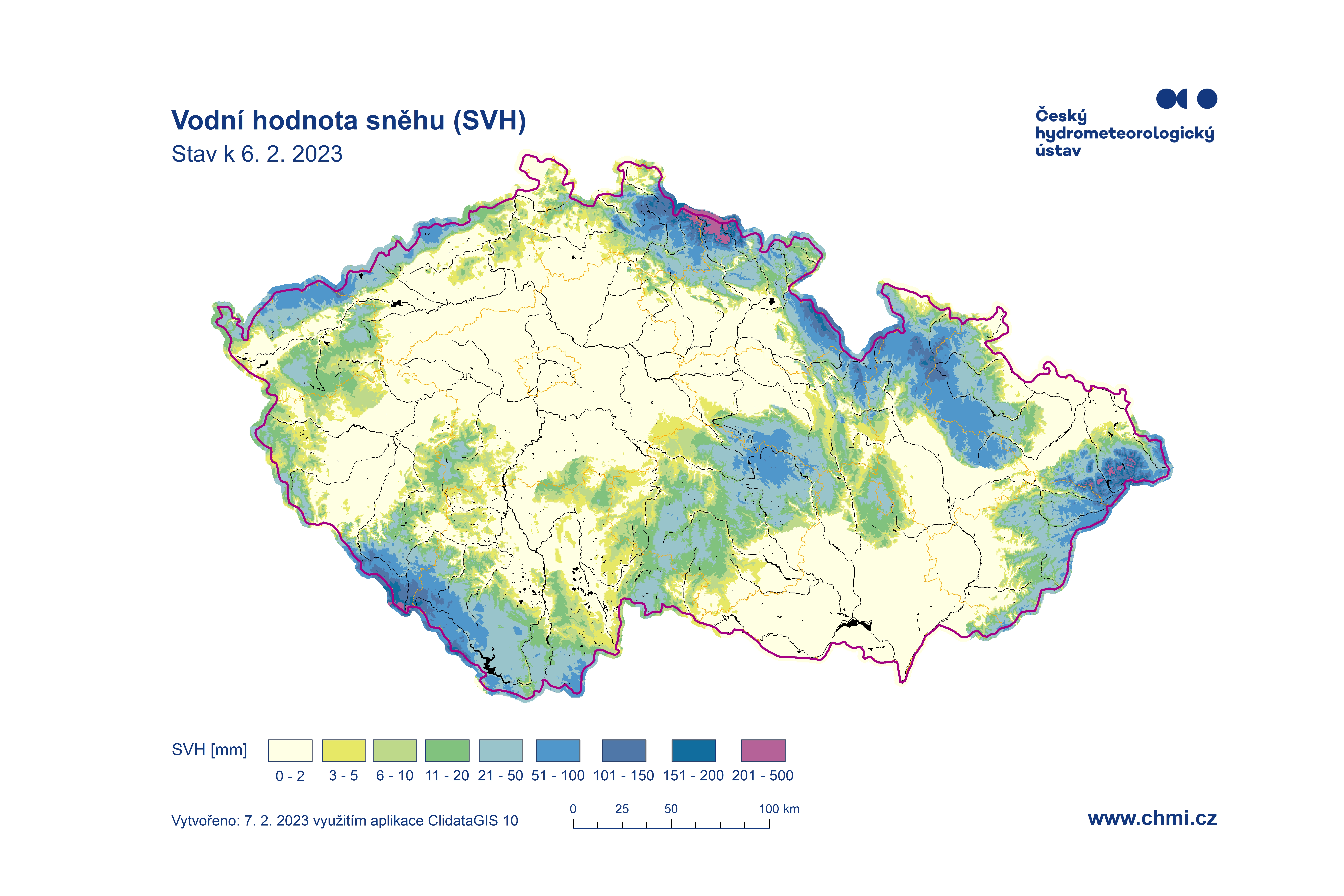 Odhad celkového množství vody ve sněhové pokrývce na území ČR k 6. 2. 2023 činí cca 1,183 mld. m3, což představuje v průměru cca 15 mm (15 litrů na jeden metr čtvereční).