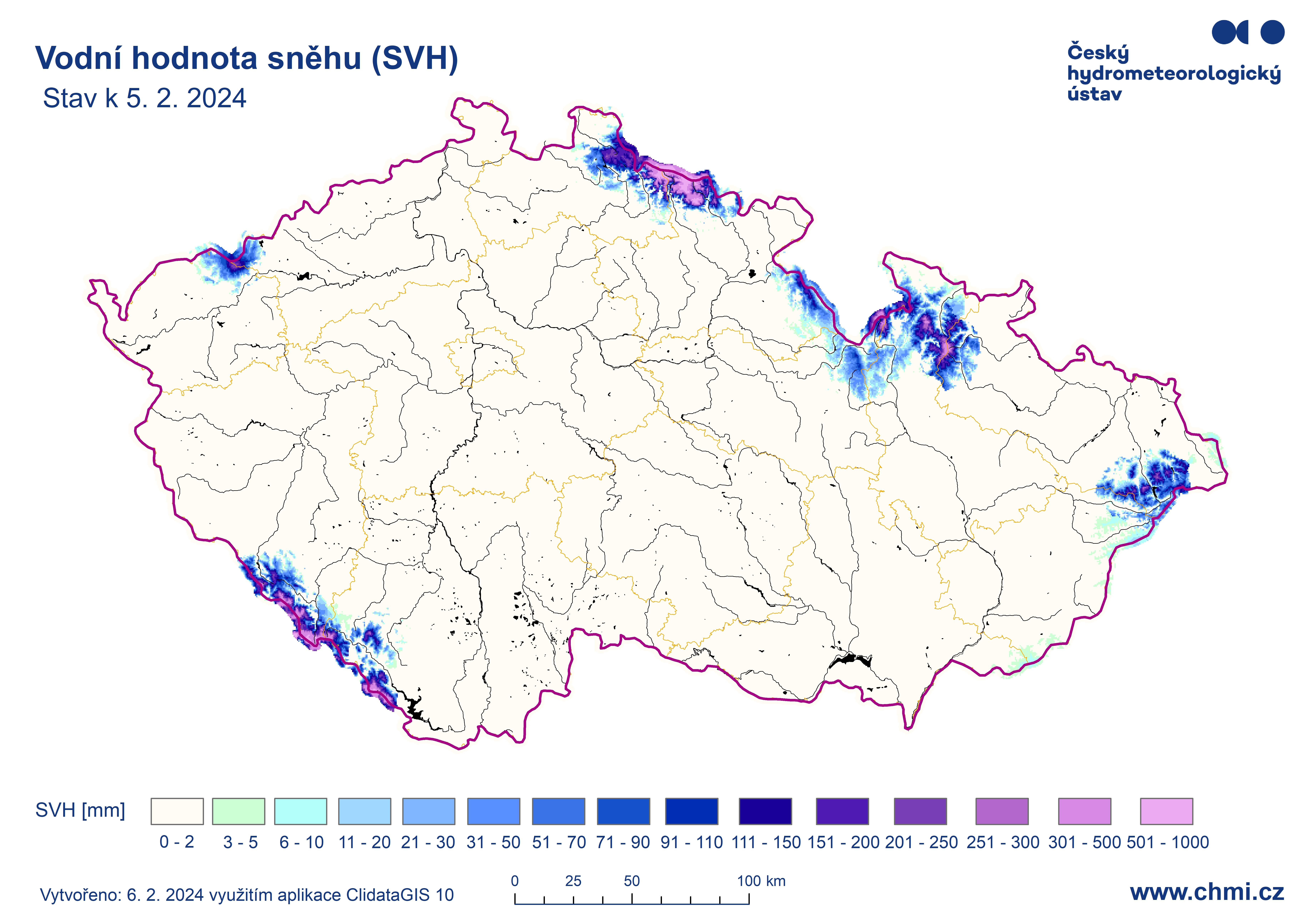 Odhad celkového množství vody ve sněhové pokrývce na území ČR k 5. 2. 2024 činí cca 0,379 mld. m3, což představuje v průměru cca 4,8 mm (4,8 litry na jeden metr čtvereční).