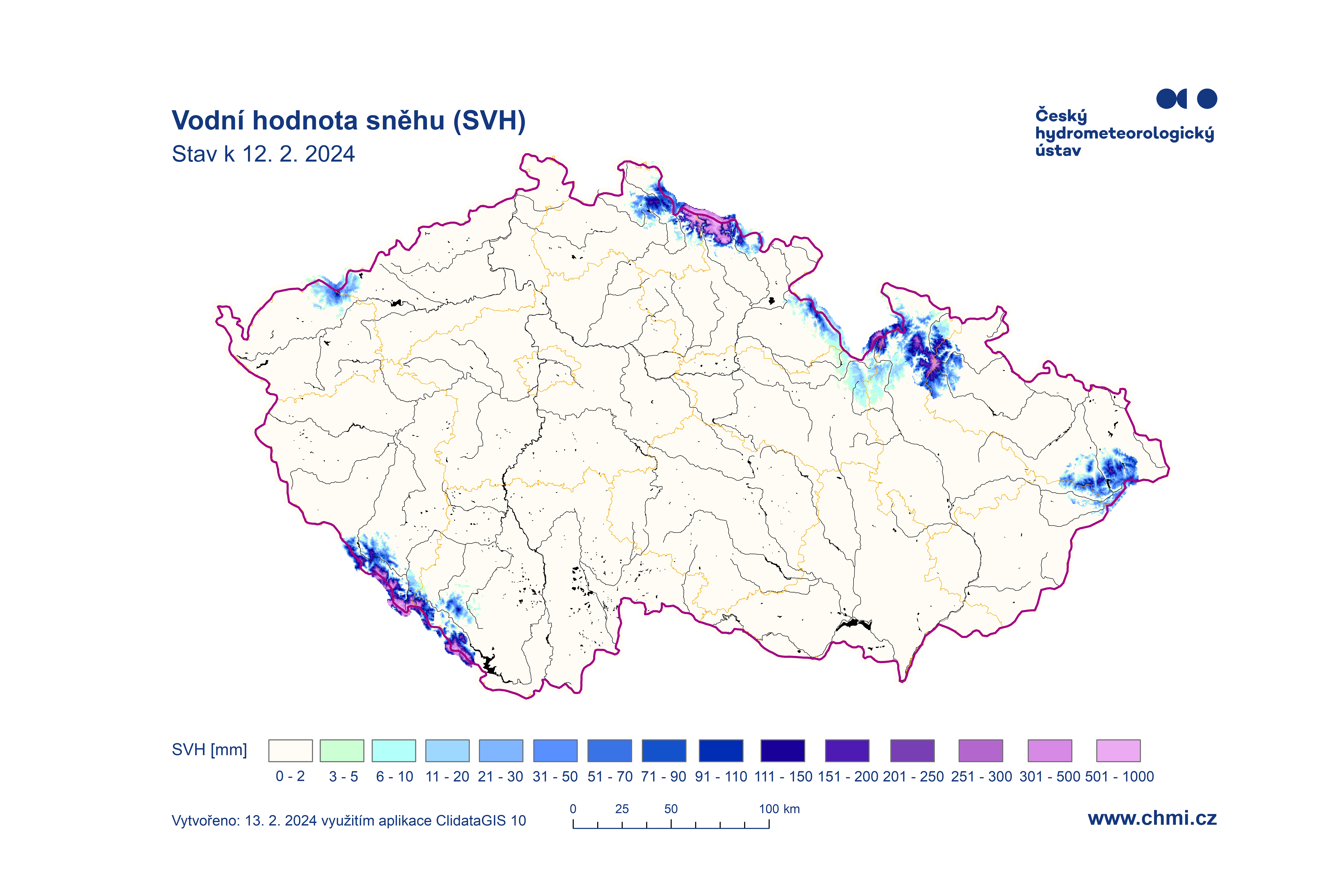 Odhad celkového množství vody ve sněhové pokrývce na území ČR ke 12. 2. 2024 činí cca 0,284 mld. m3, což představuje v průměru cca 3,6 mm (3,6 litry na jeden metr čtvereční).