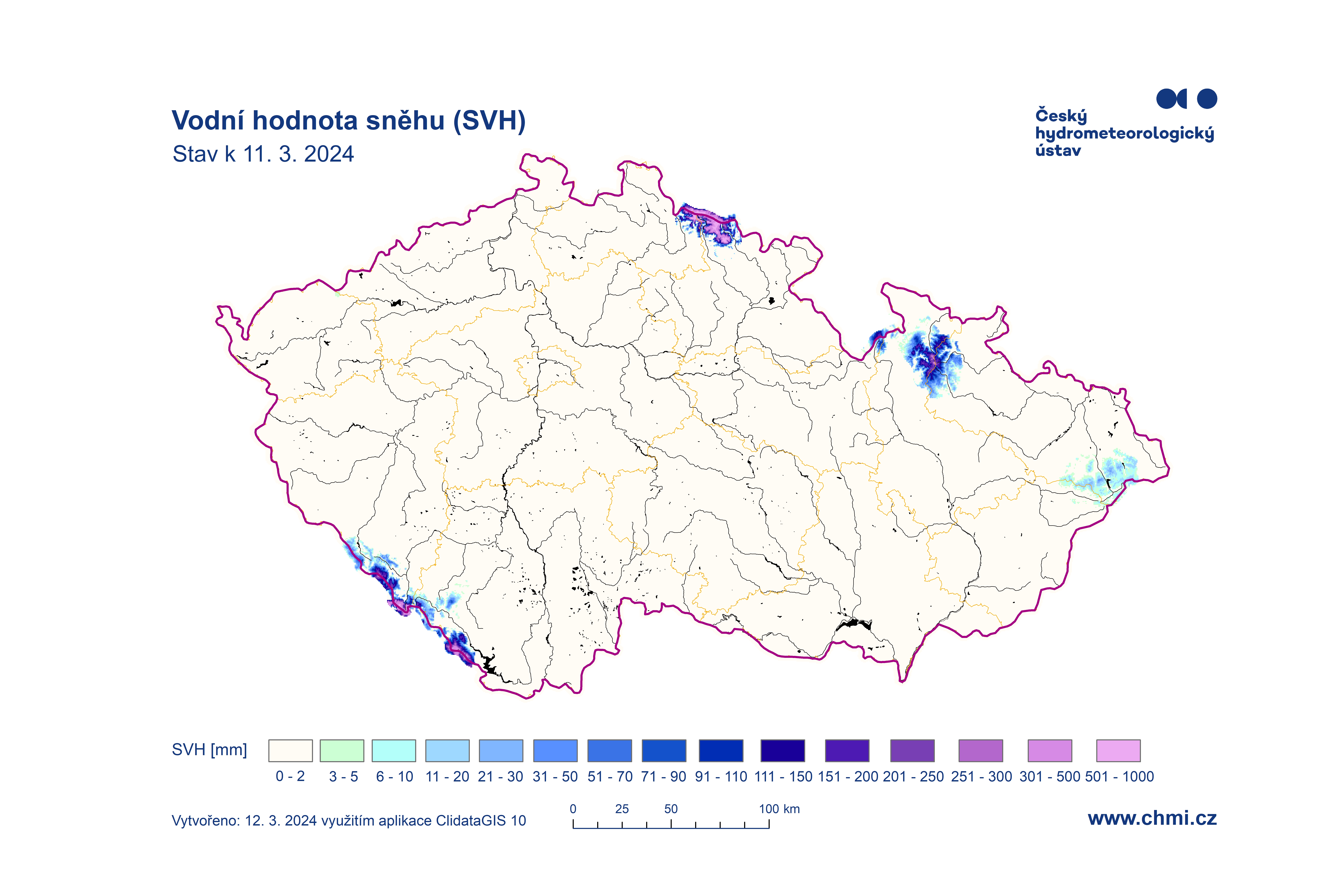 Odhad celkového množství vody ve sněhové pokrývce na území ČR k 11. 3. 2024 činí cca 0,150 mld. m3, což představuje v průměru cca 1,9 mm (1,9 litry na jeden metr čtvereční).