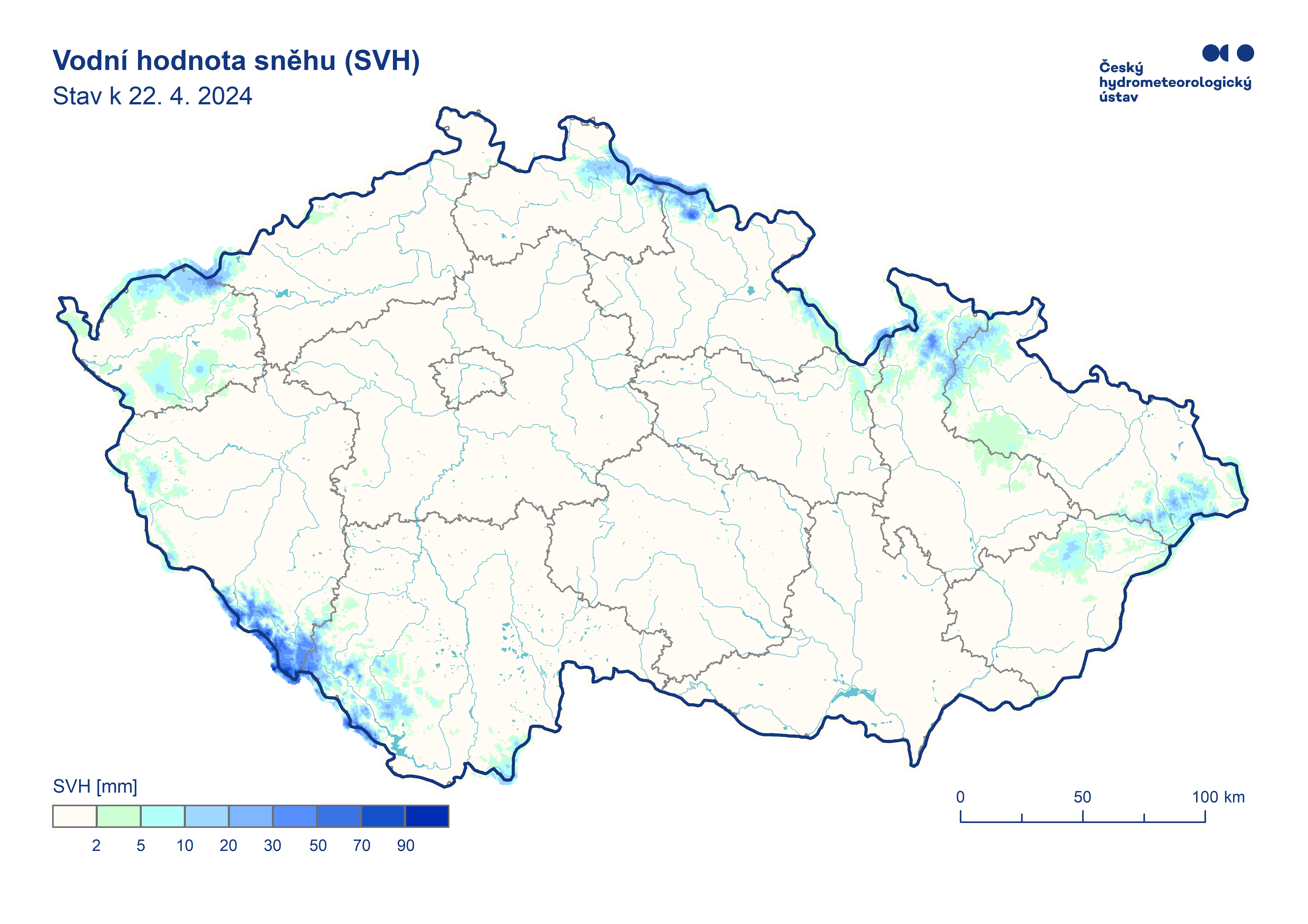 Odhad celkového množství vody ve sněhové pokrývce na území ČR k 22. 4. 2024 činí cca 0,071 mld. m3, což představuje v průměru cca 0,9 mm (0,9 litry na jeden metr čtvereční).