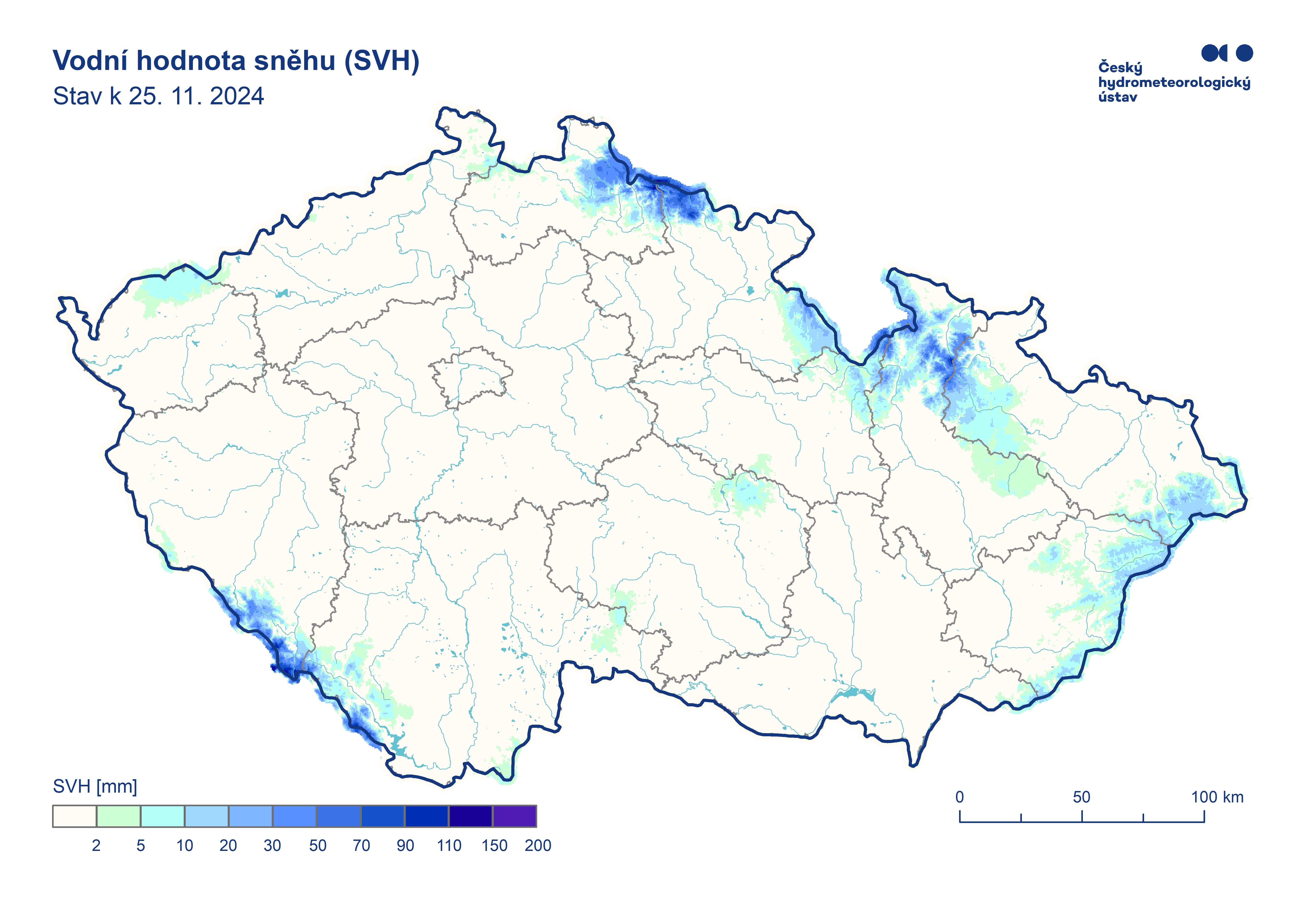 Odhad celkového množství vody ve sněhové pokrývce na území ČR k 25. 11. 2024 činí cca 0,11 mld. m3, což představuje v průměru cca 1,4 mm (1,4 litrů na jeden metr čtvereční).