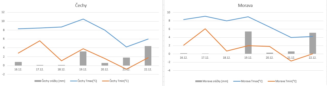 Převažovalo zataženo a oblačno, teploty byly v první půlce období výrazně nadnormální. Od pátku se po přechodu fronty od západu postupně ochladilo a teploty dosahovaly většinou normálních hodnot pro dané období. Na horách se teploty pohybovaly převážně kolem nuly a na hřebenech nejvyšších hor byl celodenní mráz. V nížinách bylo mírně nad nulou, viz. přiložené grafy.