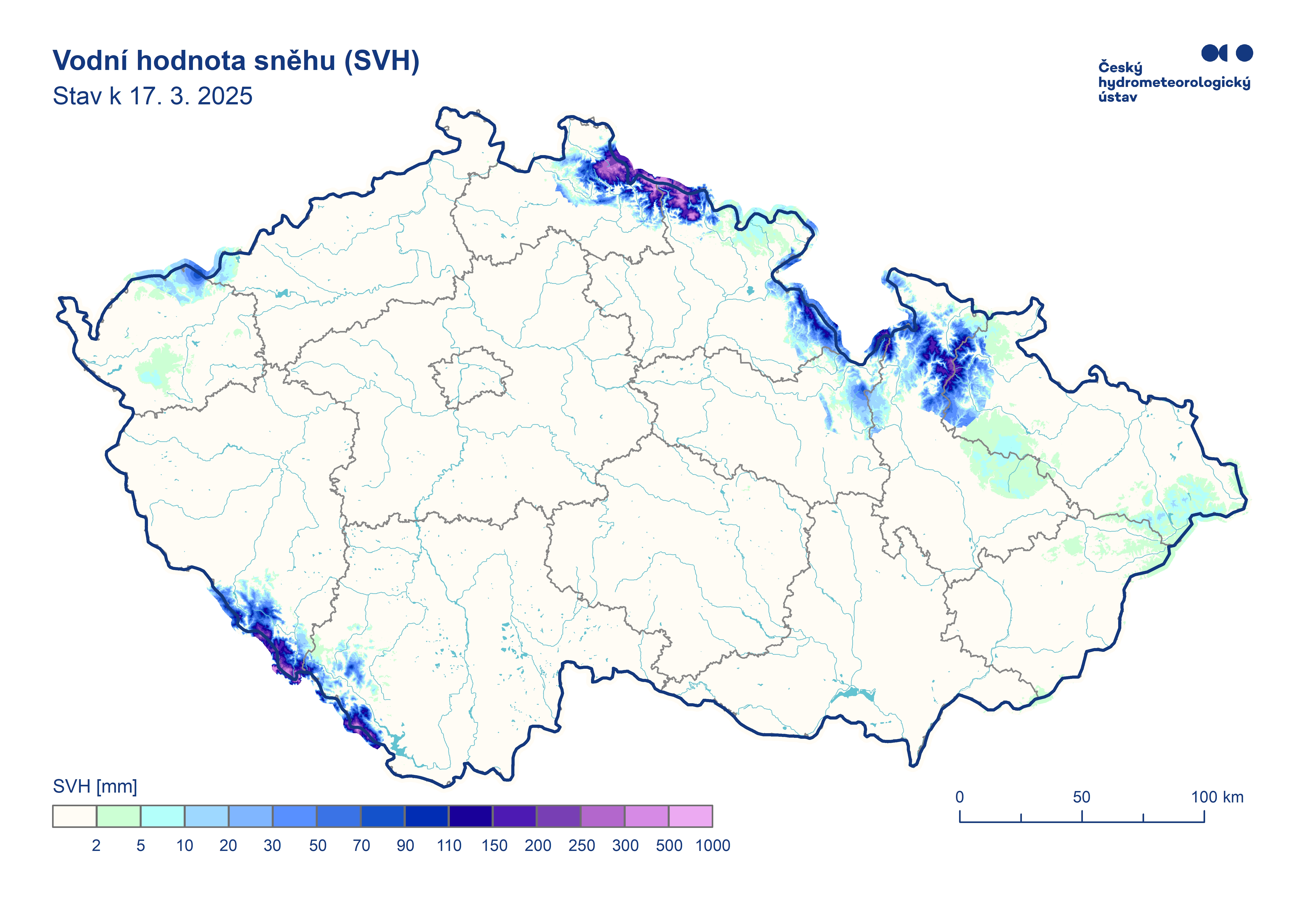 Odhad celkového množství vody ve sněhové pokrývce na území ČR k 17. 3. 2025 činí cca 0,245 mld. m3, což představuje v průměru cca 3,1 mm (3,1 litrů na jeden metr čtvereční). Zásoby vody ve sněhu se pro celkovou plochu ČR ve srovnání s předchozím týdnem slabě snížily. Oproti hodnotám z minulého týdne (17 % průměru pro 10. týden) jsou aktuálně zásoby vody ve sněhu na 18 % dlouhodobého průměru pro 11. týden v roce.