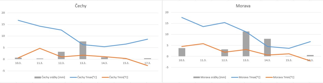 Srážky už se oproti minulým týdnům vyskytovaly častěji. Do úterního rána se vyskytly především v jihovýchodní polovině území (1 až 10 mm a výjimečně až 15 mm). V úterý během dne se na severozápadě území místy vyskytly přeháňky a ojedinělé bouřky (1 až 7 mm). Od středy do pátku se na frontálním rozhraní vyskytovaly i trvalejší srážky. Nejméně srážek se vyskytlo v západní polovině Čech, cca 1 až 8 mm. Jinde napršelo většinou 8 až 20 mm, ale na Moravě často 20 až 35 mm a výjimečně i nad 40 mm. Do nedělního rána přibylo ještě na jihovýchodě územní 1 až 5 mm srážek a do pondělního rána spadlo od několika desetin po 8 mm místy v severní polovině území, hlavně na horách.