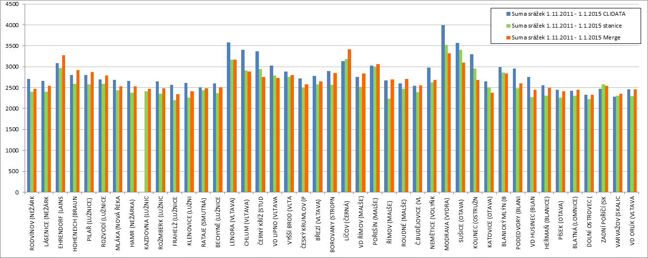 | Suma srážek 1.11.2011 - 1.1.2015 stanice | STANICE podíl ke sumě srážek z CLIDAT | Suma srážek 1.11.2011 - 1.1.2015 Merge | MERGE podíl ke sumě srážek z CLIDAT | Suma srážek 1.11.2011 - 1.1.2015 CLIDATA | Které srážkové vstupy jsou blíže MAP z CLIDAT | Nash -Sutcliffe Stanice | Nash -Sutcliffe Merge | Nash -Sutcliffe Rozdíl | Které srážkové vstupy mají lepší Nash -Sutcliffe | Průměrný průtok Stanice | STANICE Podíl průměrného simulovaného průtoku k pozorovanému průtoku | Průměrný průtok Merge | MERGE Podíl průměrného simulovaného průtoku k pozorovanému průtoku | Průměrný průtok Pozorovaný průtok | Které průměrné průtoky jsou blíže pozorování | Graf simulace průtoku | Graf simulace přítoku z mezipovodí | |