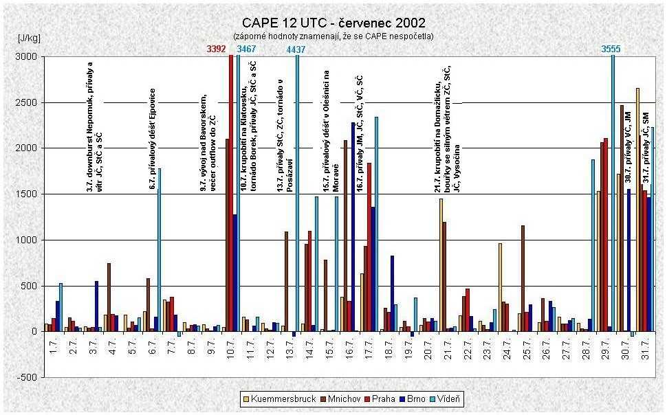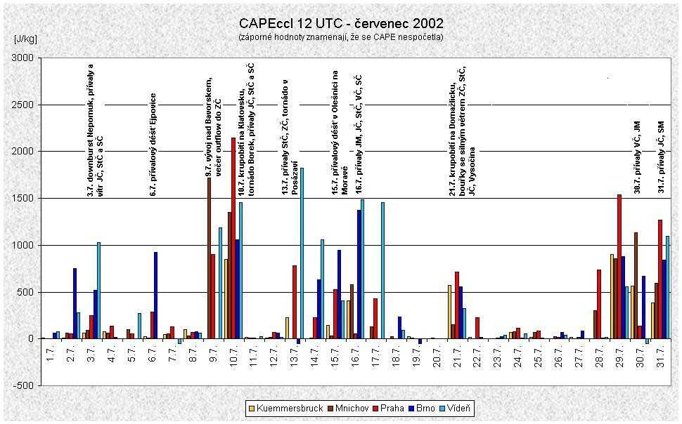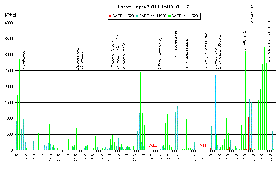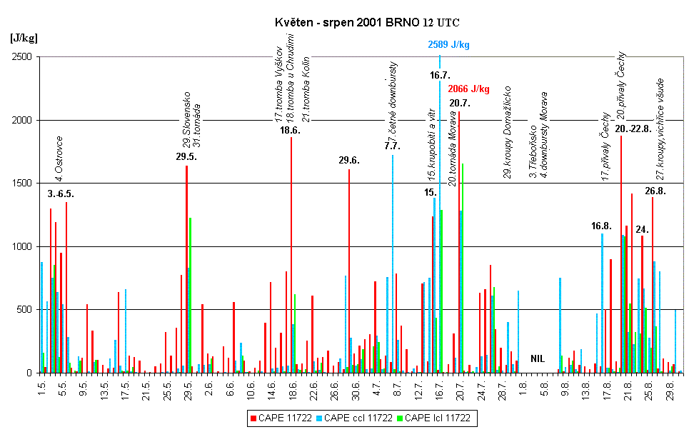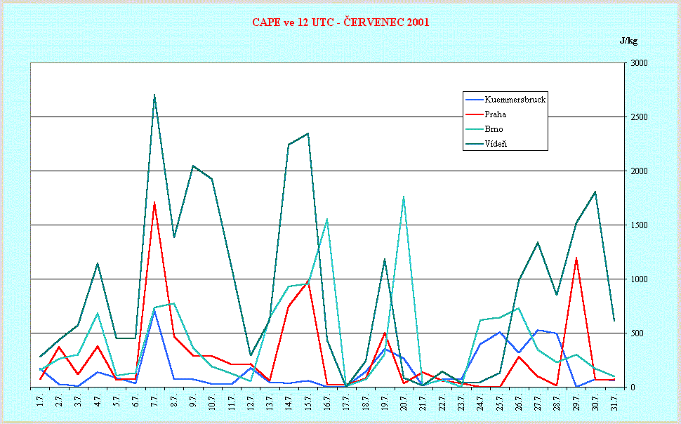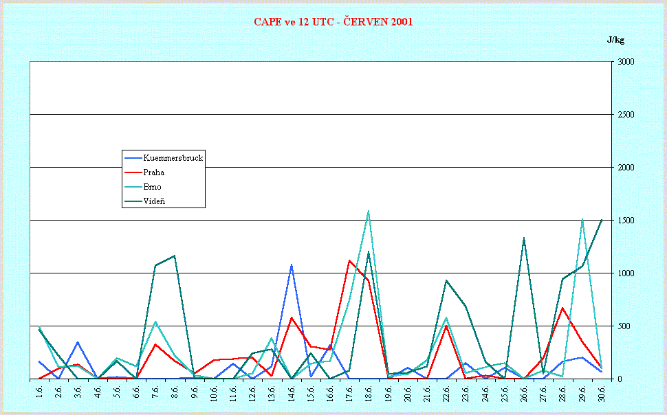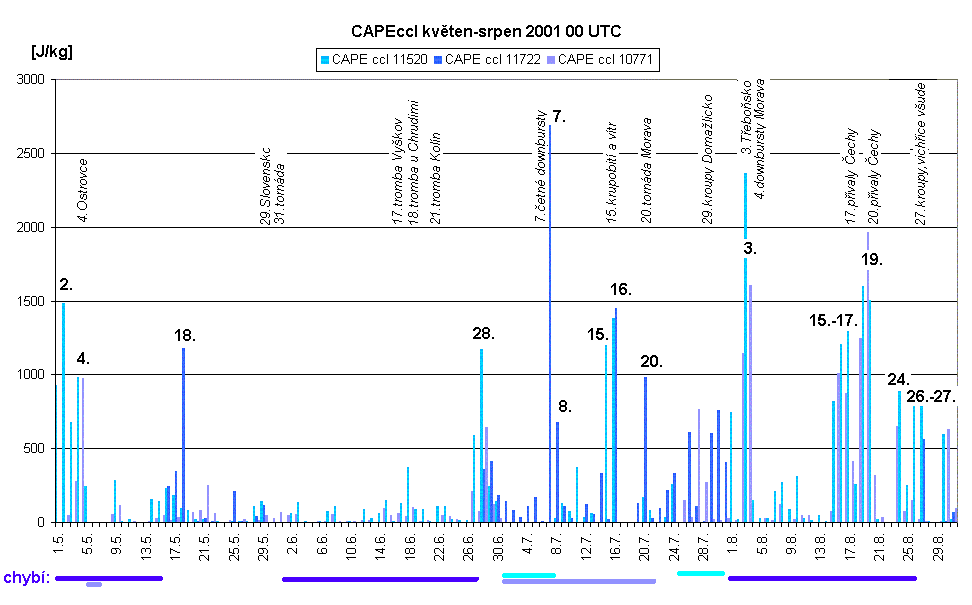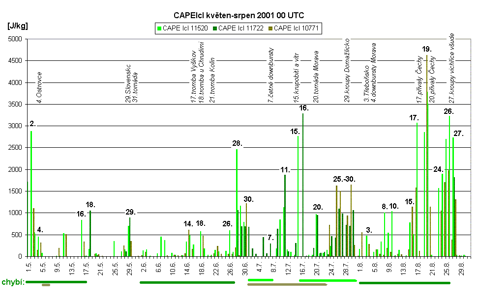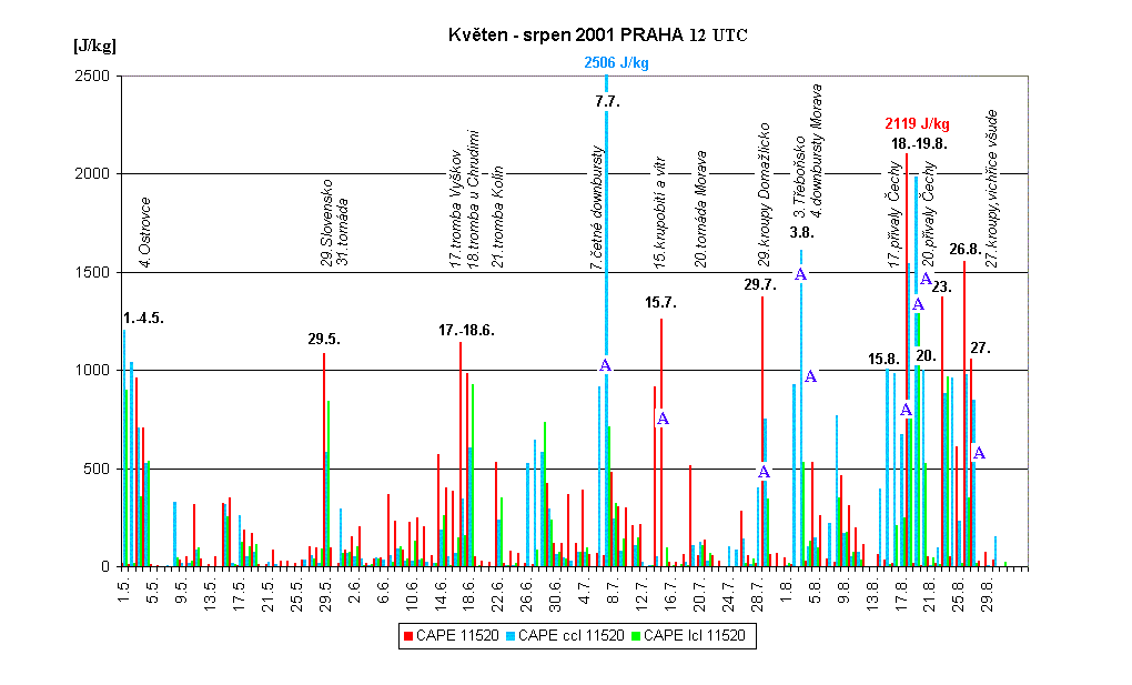 Na následujících grafech lze konfrontovat různé modifikace CAPE s nejvýznamnějšími konvektivními „událostmi“ léta 2001.