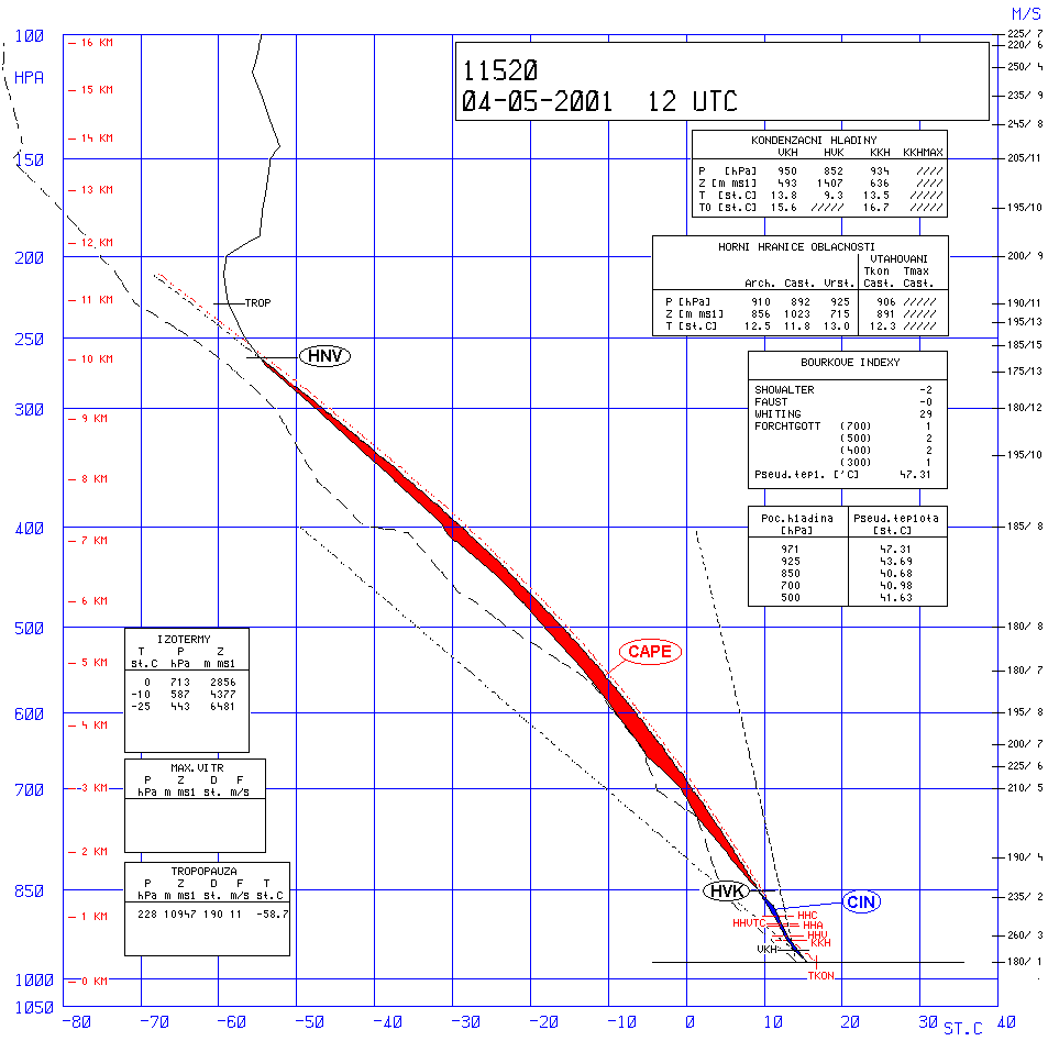instability vrstvy ohraničené hladinami HVK a HNV. Na termodynamickém diagramu je CAPE reprezentována plochou mezi