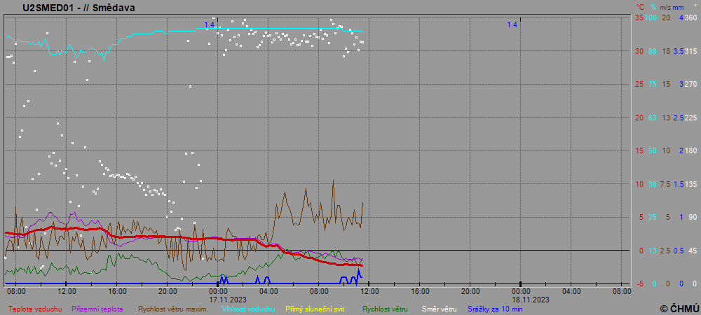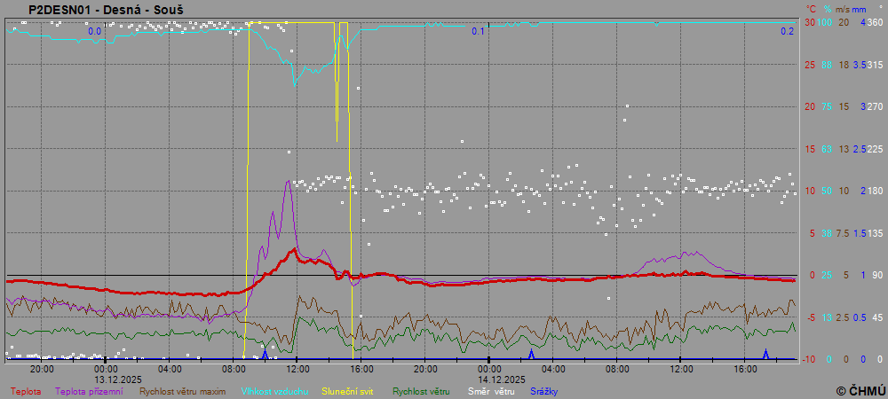 Speciální sestava: on-line počasí z horských stanic ČHMÚ - Jizerské hory. Čas na ose x je udáván v SEČ.