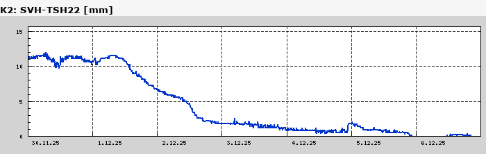 Tyto grafy zobrazují výšku sněhové pokrývky a vodní hodnotu sněhu na sněhoměrných polštářích na vybraných stanicích ČHMÚ za poslední týden. Měření je zcela automatické. Data nejsou nijak verifikována a proto je berte prosím s určitou rezervou!!! Výška sněhu je měřena ultrazvukovým čidlem. |