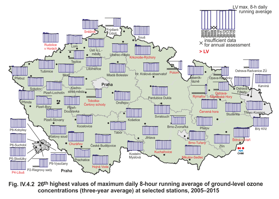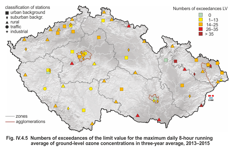 In 2015 the informative threshold value for O3 (i.e. the hourly average concentration of 180 µg.m-3) was exceeded more frequently than in previous years due to more frequent hot summer days (Table XIII.12; Chapter VI.).