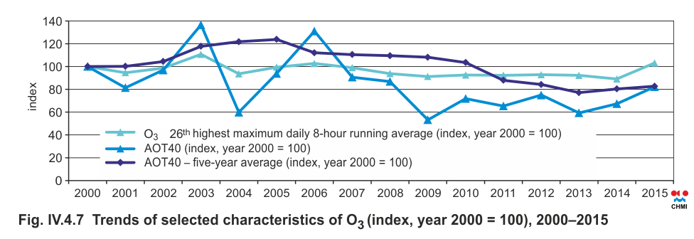 In 2015, the AOT40 exposure index (five-year average for the years 2011–2015) exhibited an increase for the second time in a row (Fig. IV.4.8 and Fig. IV.4.8).