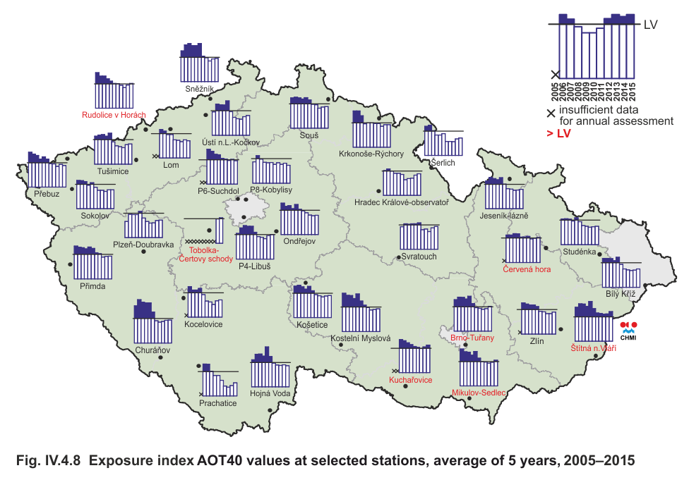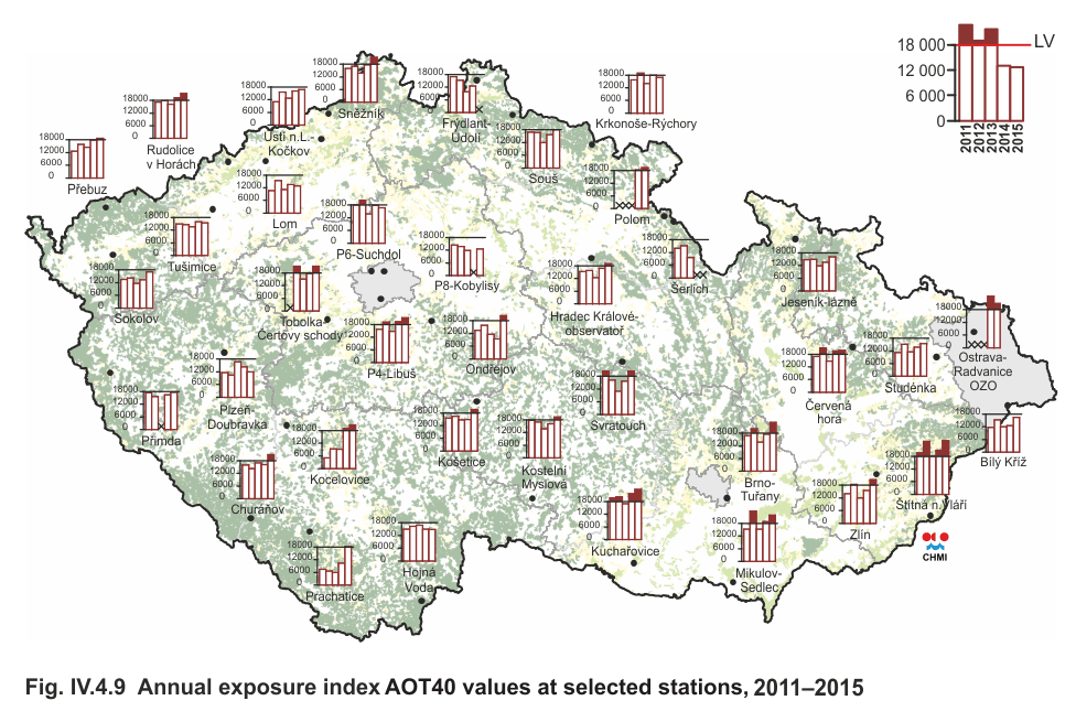 2 For assessing the protection of vegetation against excessive concentrations of ozone, the national legislature, in line with the relevant EU regulation, the AOT40 exposure index. The cumulative exposure to ozone AOT40 is calculated as the sum of differences between the hourly concentration of ozone and the threshold level of 80 μg.m-3 (= 40 ppb) for each hour in which this threshold was exceeded. As per the requirements of Government Decree No. 597/2006 Coll., the AOT40 index is calculated for the three-month period from May till July, using values measured daily between 8:00 and 20:00 CET (= 7:00 and 19:00 UTC).