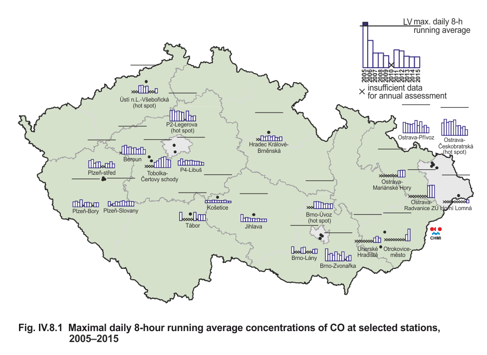 Fig. IV.8.1 shows the apparent decreasing trend of maximum 8-hour concentrations of CO at most localities in the Czech Republic. In 2015, CO concentrations were comparable with the previous year. At most stations, there was an apparent decrease, e.g. at the localities Ostrava-Českobratrská, Ostrava-Přívoz, Beroun and Plzeň-střed. Other stations, conversely, recorded increases in CO concentrations, e.g. Otrokovice-město and Brno-Zvonařka.