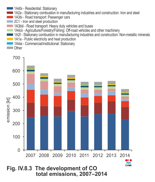Emissions of CO are produced during the combustion of carbon-containing fuels at low temperatures and under a shortage of combustion air. The greatest amount of CO emissions is produced in sector 1A4bi-Local household heating; the contribution of this sector to total countrywide CO emissions in 2014 amounted to 50.2 % (Fig. IV.8.2). Further significant sources included sectors 1A2a-Stationary combustion in manufacturing industries and construction: Iron and steel production (20.4 %), 1A3bi-Passenger car transport (9.6 %) and 1A3biii-Road freight transport over 3.5 t (4.4 %). The downward trend of CO emissions in the years 2007–2014 was caused primarily by renewal of the car fleet and a decrease of iron and steel production after the year 2007. Because of the prevailing influence of sector 1A4bi, this trend is strongly influenced by the course of temperatures during heating seasons (Fig. IV.8.3).