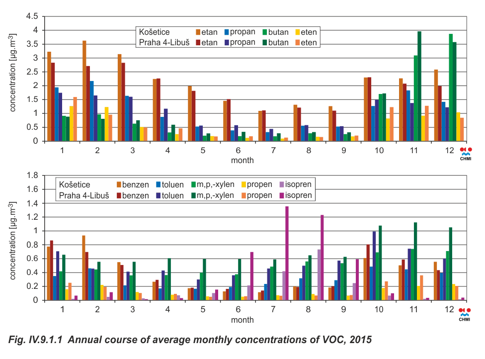 Results obtained in 2015 in no way deviate from long-term trends (Tab. IV.9.1.1). The annual progression of most VOC emissions reflects emission levels, i.e. maximum values in winter and minimum values in summer; only in the case of isoprene, the situation is the opposite (Fig. IV.9.1.1).