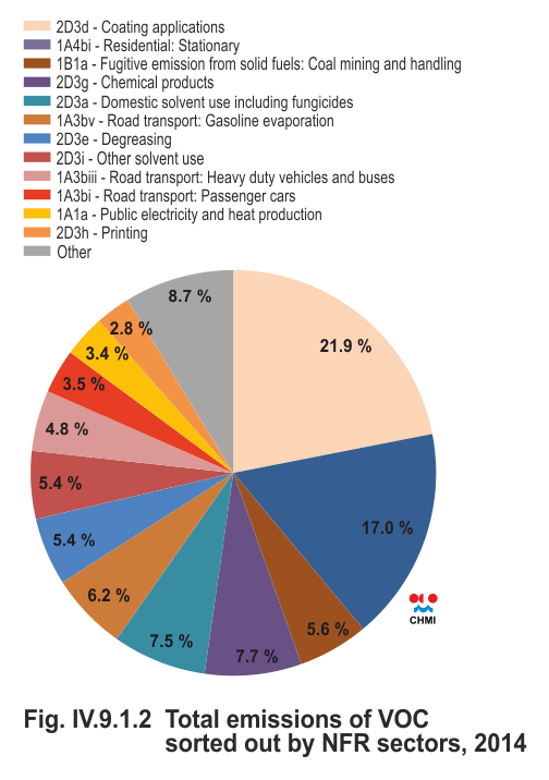 Chemical products containing VOC are used in a whole range of applications both in households and in industry as cleaning agents, thinners and degreasers. VOC may be contained in paints, varnishes, glues and pharmaceutical products. They get released during the storage or use of petroleum products. VOC are also created during imperfect combustion of fossil fuels. The most important sources of VOC emissions in the Czech Republic belong to the sector comprising the use and application of organic solvents (NFR 2D3), which in 2014 emitted 50.7 % of the emissions of these pollutants (Fig. IV.9.1.2). This sector includes the following activities: 2D3d-Coating applications (21.9 %), 2D3e-Degreasing (5.4 %), 2D3g-Chemical products (7.7 %), 2D3h-Printing (2.8 %), 2D3a-Domestic solvent use including fungicides (7.5 %) and 2D3i-Other solvent use (5.4 %). Part of these emissions are released into the atmosphere in a controlled way, but most of them escape into the air in the form of fugitive emissions, which are difficult to regulate. The largest amount of VOC emissions from combustion processes originates in sectors 1A4bi-Residential stationary combustion (17.0 %), 1A3bi-Road transport: Passenger cars (3.5 %), 1A3biii-Road Transport: Heavy duty vehicles and buses (4.8 %), and in sector 1A1a-Public electricity and heat production (3.4 %). In connection with traffic, emissions of VOC are released into the atmosphere also in the form of fumes from the fuel systems of cars and lorries, which are comprised in sector 1A3bv-oad Transport: Gasoline evaporations (6.2 %). Significant amounts of VOC are released into the atmosphere during coal mining - sector 1B1a-Coal Mining and Handling (5.6 %).