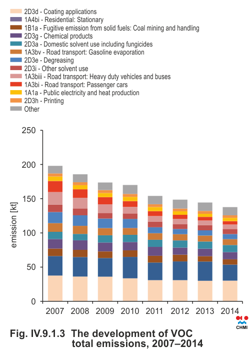 Total emissions of VOC in the period of 2007–2014 exhibited a downward trend (Fig. IV.9.1.3), which was caused by the use of products with a lower content of volatile organic substances, e.g. water-miscible paints or powder plastics. In the case of paint products packaged for retail, the legislation limits the maximum amount of solvents in products supplied to the market. Emissions of VOC from transport are continuously decreasing also thanks to the constant renewal of the car fleet.