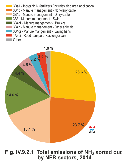 Animal farming is the main source of NH3; its share in total emissions of this pollutant in 2014 amounted to 70.0 % (Fig. IV.9.2.1). Within this sector, the largest sources of NH3 emissions were categories 3B1-Dairy cattle (41.8 %), 3B3-Swine (14.6 %), 3B4gii-Broilers (4.4 %), 3B4gi-Laying hens (3.2 %) and 3B4h-Other animals (4.5 %). Further significant sources of NH3 were sector 3Da1-Inorganic N-fertilizers (includes urea application) emitting 26.6 % of total emissions of NH3. The remaining 3.4 % of NH3 emissions are produced by mobile sources equipped with catalytic converters, in which ammonia is formed by the reduction of nitrogen oxides, and technological sources. Ammonia also enters the air during the chemical production of fertilizers, the production of mineral fibres using organic binders and the production of nitric acid, etc.