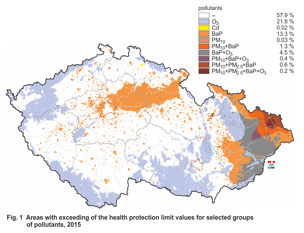 In 2015, areas with deteriorated air quality (ozone excluded) covered approximately 20.4 % of the territory of the Czech Republic, inhabited by approximately 51.5 % of the population. The overwhelming majority of these areas was delimited based on exceedances the limit values for suspended PM10 and PM2.5 particles and benzo[a]pyrene. In 2015 the assignment of areas to these regions was to a lesser extent determined by exceedances of the ambient limit for cadmium. Areas with deteriorated air quality (ozone included) covered approximately 42.1 % of the area of the Czech Republic, inhabited by approximately 55.0 % of the population (Chapter VII).