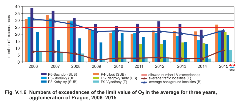 In 2015 (averaged over three years from 2013 until 2015), the limit value for ground-level ozone was exceeded at the suburban background locality Prague 4-Libuš, where the ambient limit value of 120 μg.m-3 was exceeded 27 times on average over three years, the permissible number of exceedances being 25. This ambient limit was exceeded at this locality for the first time since 2008. At the stations Prague 5-Stodůlky, Prague 6-Suchdol and Prague 2-Riegrovy sady, this limit value got exceeded more than 20 times on average over three years, i.e. in more cases than in previous years. In the evaluated period 2006–2013, the ambient limit was exceeded at the locality Prague 6-Suchdol (Fig. V.1.6). In 2015 the stagnant trend was interrupted by a significant increase in the average number of limit value exceedances for ozone per locality. This fact was influenced by extremely high temperatures and intensive solar irradiation in July and August 2015. The lowest concentrations were measured at the traffic station Prague 9-Vysočany, which corresponded to the formation of ground-level ozone and the progression of its concentrations (Chapter IV.4.3).