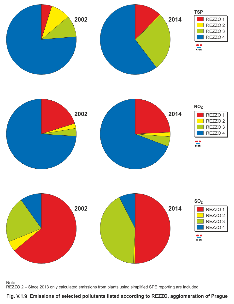 In the period 2002–2014, all monitored emissions decreased in the above significant sources. As concerns heat generating sources, the decrease is connected with the implementation of the large-scale project interlinking the thermal energy supply system Mělník-Prague, which was established in 1995. The essential decrease of SO2 emissions is related to reducing the amount of hard coal combusted in the heating plant in Malešice (starting from 2011).