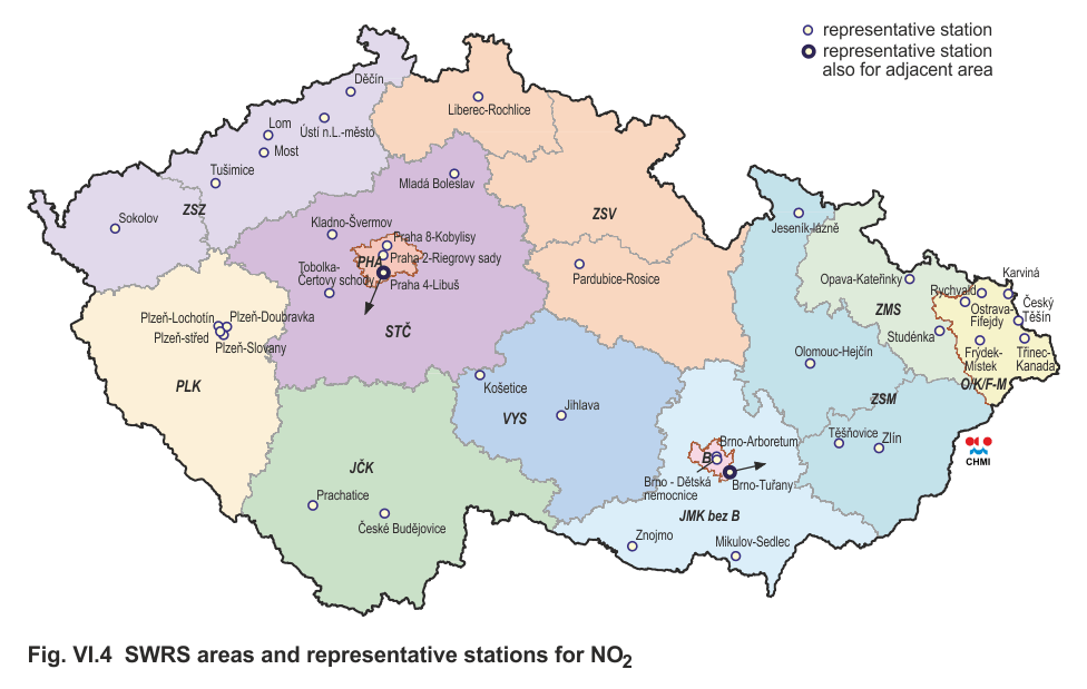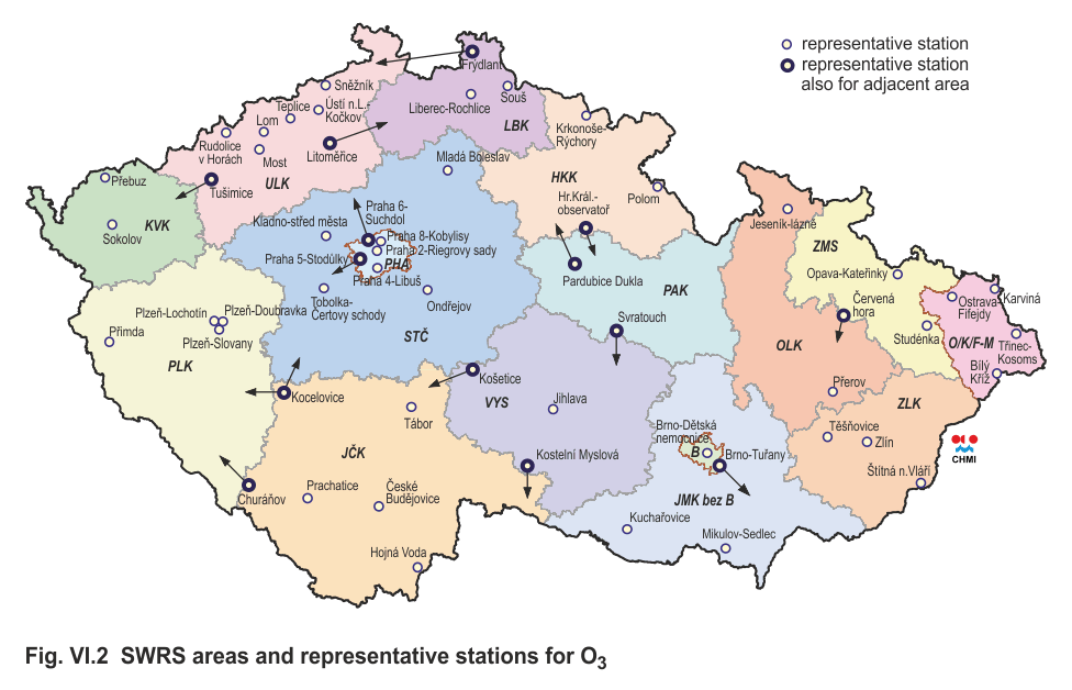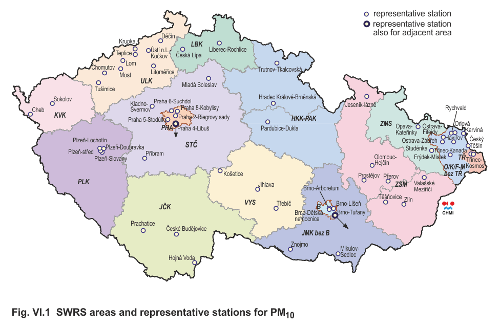 The current list of regions and stations representative of PM10, SO2 and NO2 levels (Fig. VI.1, VI.3, VI.4) is stipulated by the Journal of the Ministry of the Environment1; in the case of O3 (Fig. VI.2), it is specified by the CHMI director’s directive on the implementation of the Smog Warning and Regulatory System (SWRS) in the Czech Republic. In 2015 the list published in the Journal of the Ministry of the Environment No. 6/2014 applied to PM10, SO2 and NO2. Applicable after November 2015 was the list published in the Bulletin of the Ministry of the Environment No. 10/2015. Throughout the year, the list provided by the CHMI director’s directive No. 2013/05 applied for O3.