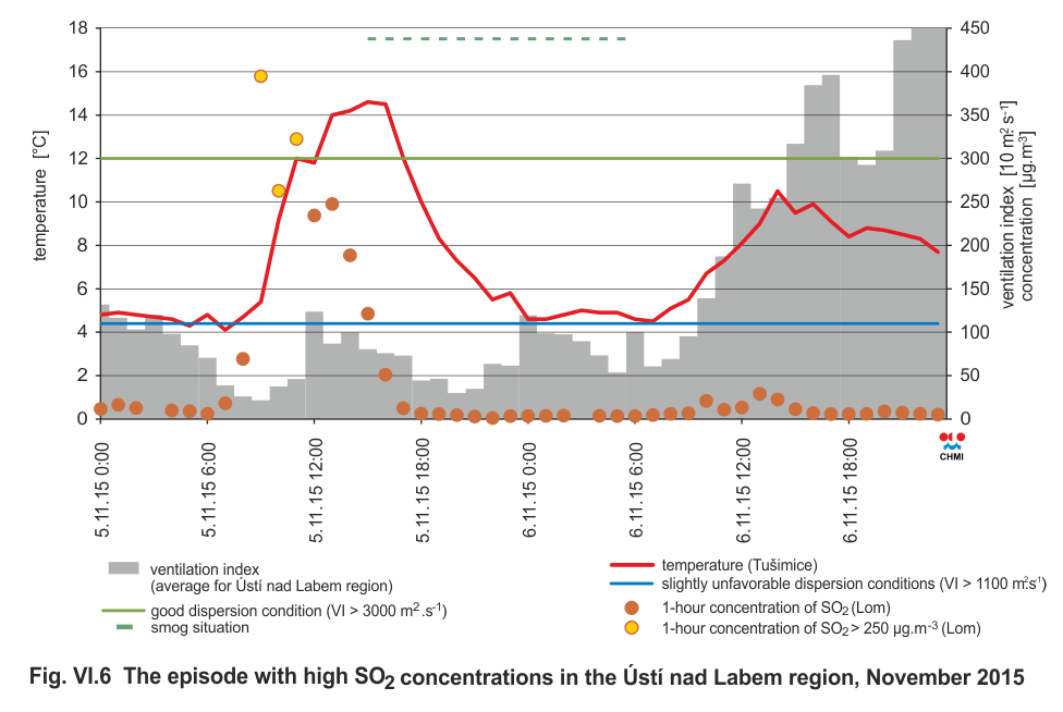In 2015, for the first time since 1997, a smog situation was declared due to high concentrations of sulphur dioxide (SO2), with a total duration of 14 h (Table VI.5). In the Ústí nad Labem region, a strong high-altitude inversion was maintained for several days and gradually turned into a ground-level inversion. This caused slow air flow and highly unfavourable dispersion conditions that allowed the accumulation of pollutants from sources close to the ground. After the perturbation of the inversion during midday hours of 5 November, pollutants from tall sources that had accumulated in upper parts of the stable inversion layer reached the ground. This caused concentrations of SO2 at the station Lom to rise sharply, and in three consecutive hours, the informative threshold value for declaring a smog situation was exceeded. Concentrations of SO2 remained high for several hours. An analogous (albeit not as pronounced) progression could be observed at other AIM stations. The situation improved before the next day, so the smog situation could be withdrawn in morning hours of 6 November (Table VI.6). In 2015 the regulatory threshold value for SO2 was not exceeded at any of the representative stations (Fig. VI.6).