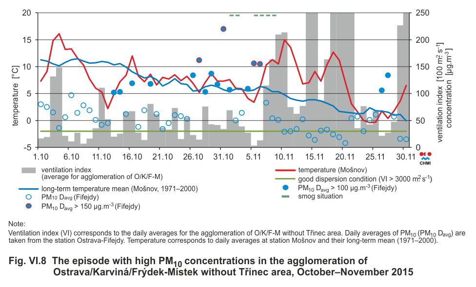 Smog situations in 2015 were declared due to excee- dances of threshold values for PM10 suspended particles and SO2. Similarly as in previous years, no smog situation was declared because of NO2. Nine smog situations were declared in 2015 due to high concentrations of suspended PM10 particles, lasting a total of 418 hours (ca 17 days; Table VI.2). Eight of them were declared in the first decade of November in the O/K/F-M agglomeration excluding the Třinec area, the Prague agglomeration and the Brno agglomeration, in the Ústí nad Labem region, the Hradec Králové region and the Pardubice region, and in the Central Bohemia zone and the Central Moravia zone (Table VI.3). The overall small number of declared smog situations was associated with more favourable dispersion conditions in the cold part of the year as a consequence of abnormally warm weather and a numerous frontal systems crossing the territory of the Czech Republic. In 2015 the regulatory threshold value for PM10 was exceeded at two representative SWRS stations; however, the legal conditions for imposing a regulatory regime were not met.