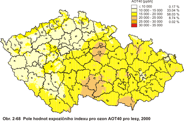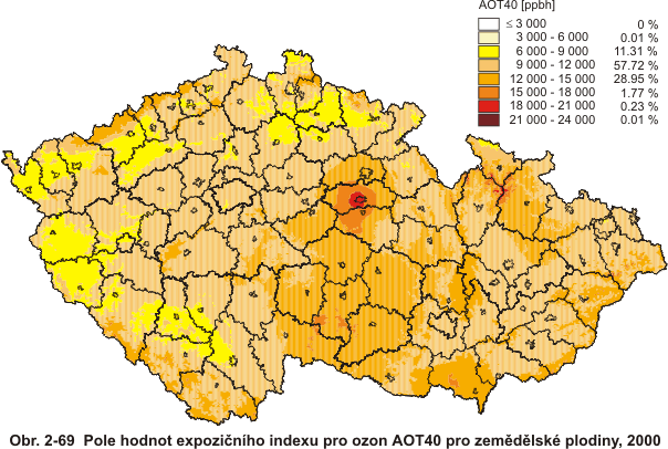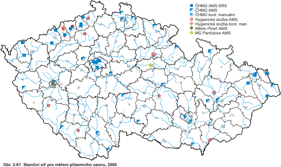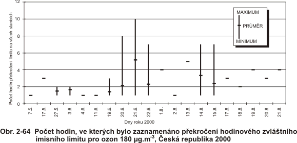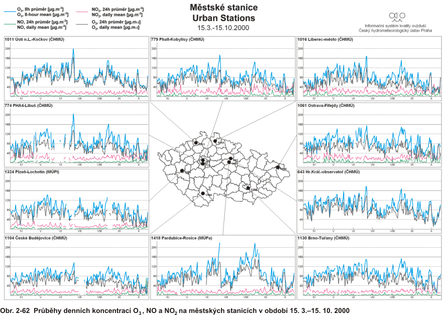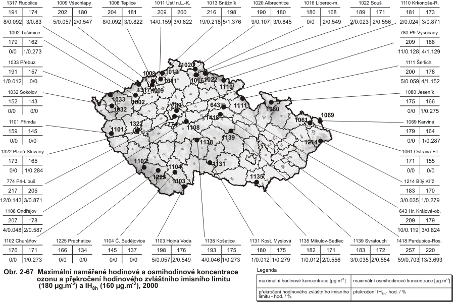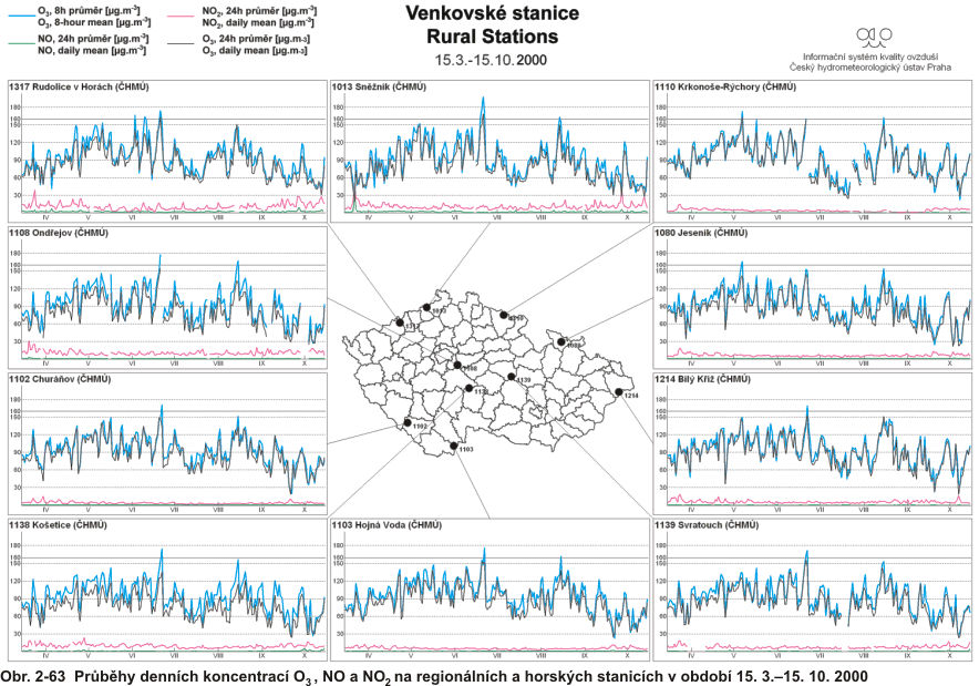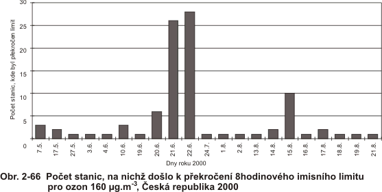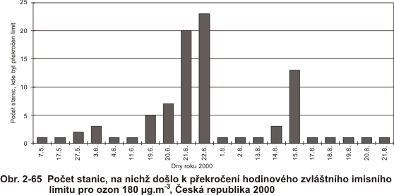 Přízemní ozon se měří v monitorovací síti AIM od roku 1992. V roce 2000 měřila na území České republiky celkem 61 stanice. Měřicí lokality jsou uvedeny na obr. 2-61. Přízemní ozon je plynem, ke kterému se upírá značná pozornost odborníků v souvislosti s možným negativním ovlivněním receptorů všech typů, což se odráží i ve zvýšení počtu monitorovacích stanic ozonu na našem území v posledních letech. Na druhé straně je nutné si uvědomit, že vzhledem k poměrně nízké prostorové variabilitě koncentrací přízemního ozonu není pro jeho monitorování potřeba tak velkého počtu stanic jako pro měření jiných škodlivin (např. SO2, NOx, SPM). Ozon je označován za sekundární znečišťující látku v ovzduší. Nemá totiž vlastní významný zdroj emisí, ale vzniká v ovzduší celou řadou chemických reakcí z tzv. prekursorů, kterými jsou oxidy dusíku a těkavé organické látky (VOC), za účinku slunečního záření a spolupůsobení O2. Koncentrace ozonu roste se zvyšující se teplotou. V noci i ve dne dochází k rozkladu molekul ozonu chemickými reakcemi s redukujícími složkami ovzduší. Chemické reakce vedoucí ke vzniku ozonu mají za následek roční chod ozonu s nejvyššími koncentracemi na jaře a v létě. Nejnižší koncentrace ozonu jsou pozorovány v zimě. Tab. 2-72 znázorňuje roční chod koncentrací a vypočtené roční statistické charakteristiky pro ozon na vybraných stanicích v České republice. Uvedené hodnoty jsou stanoveny na všech stanicích metodou UV-absorbance. Na obr. 2-62 a 2-63 je zachycen roční průběh denních koncentrací O3 zvlášť pro stanice městské a venkovské spolu s ročním průběhem denních koncentrací NO a NO2, které se významnou měrou podílejí na vzniku a odbourávání ozonu. Pro lepší čitelnost grafů není znázorněn celý rok, ale pouze období od 15. března do 15. října, tedy období s výskytem vyšších úrovní ozonu, zima je z hlediska měřených koncentrací ozonu pokládána za nevýznamnou. Koncentrace ozonu během dne vzrůstá v důsledku promíchávání spodních vrstev vzduchu s vrstvami ležícími výše, ve kterých jsou vyšší koncentrace ozonu, a v důsledku vzniku ozonu fotochemickými reakcemi. Denní chody jsou výraznější na městských stanicích než na stanicích venkovských. Tento rozdíl je způsoben zčásti rychlejší destrukcí ozonu v městském ovzduší během večerních a nočních hodin, ke které dochází v důsledku vyšších koncentrací oxidů dusíku. Koncentrace ozonu ve venkovských oblastech položených ve vyšší nadmořské výšce nevykazují tak výrazný denní chod s velkými rozdíly mezi denními a nočními hodnotami a vysoké koncentrace O3 mohou přetrvávat i během noci. Platný imisní limit pro ozon je 160 µg.m-3 (8hodinový průměr – Opatření FVŽP ze dne 1. 10. 1991 k zákonu o ovzduší č. 309/91 Sb., v plném znění č. 211/94 Sb.). Zvláštní imisní limity pro vyhlášení signálu upozornění na výskyt fotochemického smogu jsou 180 µg.m-3 (hodinový průměr) – informování veřejnosti a 360 µg.m-3 (hodinový průměr) – varování veřejnosti (vyhl. č. 279/93 Sb.). Hodinový zvláštní imisní limit 360 µg.m-3 nebyl v roce 2000 překročen. K překročení hodinového zvláštního imisního limitu 180 µg.m-3 došlo během celého roku ve 259 případech na celkem 32 stanicích. Maximální zaznamenaná hodinová koncentrace ozonu 257 µg.m3 byla naměřena 15. srpna 2000 v 15 hod. na stanici Pardubice-Rosice. Nejvyšší 8hodinová průměrná koncentrace 219,6 µg.m-3 byla zaznamenána 21. června 2000 na téže stanici. 8hodinový imisní limit byl celkem překročen v 94 případech, a to na 38 stanicích. Z tab. 2-73 je zřejmé, že k překročení hodinového zvláštního imisního limitu došlo ve třech jednotlivých dnech v květnu, v červnu byly zaznamenány dvě epizody v délce trvání 3 a 4 dny a nejdelší epizoda o délce 8 dnů nastala v srpnu. Maximální dosažené koncentrace se pohybovaly v rozmezí 191–256 µg.m-3 v červnu a 187–257 µg.m-3 v srpnu. Tab. 2-74 dokumentuje překročení 8hodinového imisního limitu pro ozon. To bylo zaznamenáno ve dnech 7. 5., 17. 5., 27. 5., 3.–10. 6., 19.–22. 6., 24. 7., 1.–2. 8. a 13.–21. 8. Naměřené maximální koncentrace se pohybovaly v rozmezí 161–220 µg.m-3. V porovnání s rokem 1999 bylo zaznamenáno více epizod i vyšší koncentrace a tedy i větší a častější překročení platných imisních limitů. Na obr. 2-64 je prezentován počet hodin, ve kterých bylo zaznamenáno překročení zvláštního hodinového imisního limitu pro ozon 180 µg.m-3, na obr. 2-65 a 2-66 pak počet stanic, na nichž došlo k překročení zvláštního hodinového imisního limitu pro ozon 180 µg.m-3, resp. k překročení 8hod imisního limitu 160 µg.m-3. Obr. 2-67 udává přehledně maximální naměřené hodinové a osmihodinové koncentrace ozonu a dále překročení hodinového zvláštního imisního limitu a osmihodinového limitu na vybraných stanicích v České republice. Tab. 2-75 podává dlouhodobou charakteristiku koncentrací a překračování imisních limitů za celé období monitoringu přízemního ozonu u nás. Prezentuje přehledným způsobem počty překročení 8hodinového imisního limitu a hodinového zvláštního imisního limitu na všech stanicích pro každý rok. V letošní Ročence se stejně tak jako v předcházejících letech hodnotí vliv přízemního ozonu na lesní ekosystémy a zemědělské plodiny. V souladu se závěry pracovního semináře zabývajícího se určením kritických úrovní ozonu Evropské hospodářské komise (Working Group on Effects, 13th session, Ženeva, 29. 6.–1. 7. 1994) byla hodnocena dlouhodobá kritická úroveň pro ozon vyjádřená jako kumulativní expozic