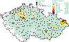 Oxid siřičitý Stav úrovně znečištění České republiky oxidem siřičitým v roce 2001 ukazují mapová znázornění polí ročních aritmetických průměrů a 95% kvantilů denních koncentrací se zobrazením naměřených hodnot na stanicích (obr. 2.2.1 a 2.2.2). V podstatě na celém území České republiky dosahovaly v roce 2001 roční aritmetické průměry koncentrací oxidu siřičitého nejvýše 20 μg.m-3. Na celém území České republiky, kromě velmi malé plochy, se v roce 2001 pohyboval 95% kvantil denních průměrů oxidu siřičitého pod hodnotou 50 μg.m-3. Jedinou postiženou oblastí, kde v posledních letech ojediněle docházelo k překračování imisních limitů oxidu siřičitého, byly severní Čechy, zejména pánevní oblast Podkrušnohoří. V této oblasti bylo v roce 2001 zaznamenáno ojediněle znečištění nad 20 μg.m-3 v ročním aritmetickém průměru, tj. nad třetinou imisního limitu. Nejvyšší hodnoty v této imisní charakteristice vykazovaly stanice hygienické služby Teplice-OHS a Úštěk v okrese Litoměřice (viz tab. 2.2.2, 2.2.3, 2.2.4 a 2.2.5). Pouze na stanici Teplice-OHS byla zaznamenána relativní četnost překročení denního imisního limitu (IHd) nad 1 % případů (tab. 2.2.4). Mírné zvýšení koncentrací oxidu siřičitého, proti roku 2000, zaznamenaly stanice v severní části okresu Karviná, kde lze předpokládat ovlivnění z Polska z katovické aglomerace. V ostatních oblastech České republiky bylo znečištění ovzduší oxidem siřičitým velmi malé, výrazně pod hodnotou imisních limitů. Prašný aerosol Stav úrovně znečištění České republiky prašným aerosolem v roce 2001 zachycují mapová znázornění polí ročních aritmetických průměrů a 95% kvantilů denních koncentrací se zobrazením naměřených a přepočtených hodnot na stanicích (obr. 2.2.3. a 2.2.4). Na 88 % území České republiky byly hodnoty ročních aritmetických průměrů prašného aerosolu nižší než 30 μg.m-3. V podstatě na celém území České republiky dosahovaly v roce 2001 roční aritmetické průměry koncentrací prašného aerosolu nejvýše 50 μg.m-3. Na 97 % území byl 95% kvantil ročních souborů denních průměrů nižší než 80 μg.m-3. Nejvíce postiženou oblastí prašným aerosolem bylo v minulosti Ostravsko (nyní součást Moravskoslezského kraje). Tato charakteristika platí i v roce 2001, pokud se týká velikosti zasaženého území koncentracemi 40-60 μg.m-3 v ročním aritmetickém průměru. V roce 2001, podobně jako v minulých letech, došlo k největšímu překročení imisních limitů v hlavním městě Praze na dvou stanicích hygienické služby s exponovanou polohou a dále pak na AMS v Mělníku (tab. 2.2.3, 2.2.4 a 2.2.5). Ve východní části Moravskoslezského kraje byly naměřeny největší maximální denní koncentrace prašného aerosolu a některé AMS vykazovaly v ročním aritmetickém průměru překročení imisního limitu této látky po přepočtu z frakce PM10. Podobně jako v případě oxidu siřičitého, zaznamenala zejména severní část okresu Karviná určité zvýšení znečištění ovzduší prašným aerosolem proti roku 2000. Příčinou bylo zřejmě ovlivnění imisních stanic z polských zdrojů z katovické aglomerace. Kromě uvedených oblastí bylo evidováno znečištění přes 40 μg.m-3 v ročním aritmetickém průměru v městě Brně, v pásu od Prahy po Litoměřice a v pánevní oblasti Podkrušnohoří. V 95% kvantilu byly koncentrace prašného aerosolu přes 80 μg.m-3 zaznamenány ve východní části Moravskoslezského kraje, v centru Prahy a v okresech Mělník a Litoměřice. Oxidy dusíku Stav úrovně znečištění České republiky oxidy dusíku v roce 2001 ukazují mapová znázornění polí ročních aritmetických průměrů a 95% kvantilů denních koncentrací se zobrazením naměřených hodnot na stanicích (obr. 2.2.5 a 2.2.6). Na 89 % území České republiky dosahovaly v roce 2001 roční aritmetické průměry koncentrací oxidů dusíku nejvýše 20 μg.m-3. Na 97 % území byl 95% kvantil ročních souborů denních průměrů nižší než 70 μg.m-3. Nejvíce postiženou oblastí ve znečištění ovzduší oxidy dusíku bylo a stále je hlavní město Praha, kde v posledních letech došlo téměř na všech stanicích k překročení denního imisního limitu ve více než 5 % případů. Tato charakteristika platí i pro rok 2001, kdy opět bylo zaznamenáno největší překročení imisních limitů na dvou stanicích hygienické služby s exponovanou polohou (tab. 2.2.3, 2.2.4 a 2.2.5). Uvedené překročení v 95% kvantilu vykazovaly také některé městské stanice v severozápadních a středních Čechách, ve východní části Moravskoslezského kraje, dále pak ve městech Hradec Králové, Brno a Zlín. Přízemní ozon Přízemní ozon se měří v rámci automatizovaného imisního monitoringu na území České republiky již od roku 1992. V roce 2001 se měřilo celkem na 62 stanicích situovaných ve všech oblastech České republiky. Platný 8hod. imisní limit pro ozon 160 μg.m-3 byl v roce 2001 překročen pouze v 9 případech na celkem 6 stanicích. Nejvyšší 8hodinová průměrná koncentrace 175,6 μg.m-3 byla zaznamenána 31. července 2001 na stanici Tušimice. Hodinový zvláštní imisní limit 360 μg.m-3 nebyl v roce 2001 překročen. K překročení hodinového zvláštního imisního limitu 180 μg.m-3 došlo během celého roku ve 25 případech na celkem 9 stanicích. Maximální zaznamenaná hodinová koncentrace ozonu 198,3 μg.m-3 byla naměřena 31. července 2001 na stanici Přimda. K epizodám překročení limitů v r. 2001 nedošlo. 8hodinový limit byl opakovaně překročen pouze ve dnech 27. 5., 27. 6., 7. 7. a 31. 7, dosažené koncentrace se pohybovaly mezi 162,2 a 175,6 μg.m-3. Hodinový limit byl o