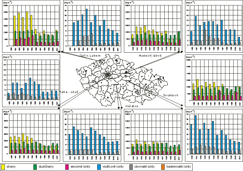Tab. 3.4 Staniční sítě sledování kvality srážek a atmosférické depozice Tab. 3.5 Průměrné roční koncentrace základních složek ve srážkách na uvedených stanicích Tab. 3.6 Roční mokrá atmosférická depozice na uvedených stanicích Obr. 3.1 Staniční sítě sledování kvality srážek a atmosférické depozice Obr. 3.2 Pole mokré roční depozice síry (SO42- - S) Obr. 3.3 Pole suché roční depozice síry (SO2 - S) Obr. 3.4 Pole celkové roční depozice síry Obr. 3.5 Pole podkorunové roční depozice síry Obr. 3.6 Pole mokré roční depozice dusíku (NO3- - N) Obr. 3.7 Pole mokré roční depozice dusíku (NH4+ - N) Obr. 3.8 Pole celkové mokré roční depozice dusíku Obr. 3.9 Pole suché roční depozice dusíku (NOx - N) Obr. 3.10 Pole celkové roční depozice dusíku Obr. 3.11 Pole mokré roční depozice vodíkových iontů Obr. 3.12 Pole suché roční depozice vodíkových iontů odpovídající depozici plynů SO2 a NOx Obr. 3.13 Pole celkové roční depozice vodíkových iontů Obr. 3.14 Pole mokré roční depozice fluoridových iontů Obr. 3.15 Pole mokré roční depozice olovnatých iontů Obr. 3.16 Pole suché roční depozice olova Obr. 3.17 Pole mokré roční depozice kademnatých iontů Obr. 3.18 Pole suché roční depozice kadmia Obr. 3.19 Pole mokré roční depozice nikelnatých iontů Obr. 3.20 Vývoj roční mokré depozice na vybraných stanicích v letech 1990–2001, Česká republika