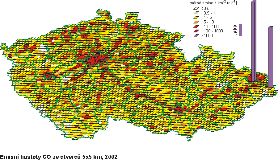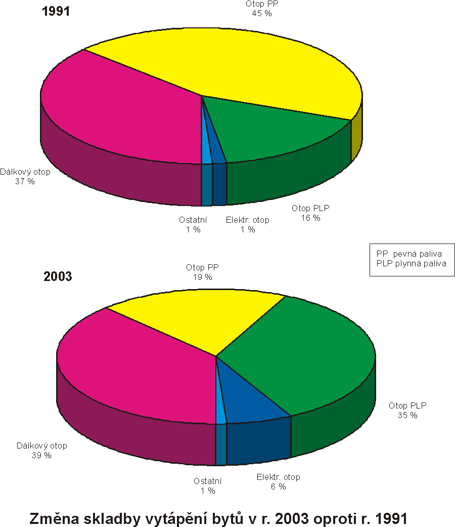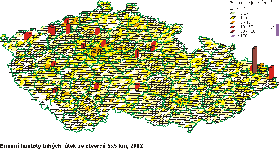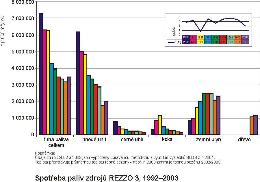 množství emisí ap.). V kategorii malých zdrojů jsou vypočítávány emise z lokálních topenišť. Primárními podklady pro výpočet jsou údaje ze Sčítání lidu, domů a bytů (SLDB) provedených v letech 1991 a 2001. Emisní bilance je modelově zpracovávána z aktualizovaných údajů o klimatických podmínkách, spotřebách tepla pro vytápění bytů a z nich vypočtených spotřeb jednotlivých druhů paliv. Skladba paliv vychází z podkladů SLDB o převládajícím způsobu vytápění a používaných druzích energií, každoročně aktualizovaných z údajů poskytnutých centrálními dodavateli paliv a energií. Bilance emisí z dopravy, která je v kompetenci MDS, byla zpracována CDV Brno podle metodiky stanovení emisí znečišťujících látek z dopravy. Emise z provozu zemědělských a lesních strojů a dalších mobilních prostředků byly vypočítány z údajů o prodeji a spotřebě pohonných hmot za rok 2003. Celková množství emisí hlavních znečišťujících látek v roce 2003, tj. tuhých znečišťujících látek (TZL), oxidu siřičitého (SO2), oxidů dusíku (NOx), oxidu uhelnatého (CO), těkavých organických látek (VOC) a amoniaku (NH3) a podíly jednotlivých kategorií zdrojů na celkových emisích jsou uvedeny v tab. 1.1. Podrobnější územně členěné údaje o emisích jsou uvedeny na webových stránkách ČHMÚ. Vývoj celkových emisí hlavních znečišťujících látek v letech 1990–2003 je uveden na obr. 1.1. Vývoj množství emisí v letech 2000 až 2003 naznačuje postupnou stabilizaci emisí stacionárních zdrojů. Mírný pokles emisí mobilních zdrojů, daný probíhající obnovou vozového parku, zejména osobních automobilů, byl zastaven nárůstem emisí z nákladní dopravy. V dalších letech by úroveň emisí neměla výrazně překračovat současné hodnoty. Podrobná evidence emisí plynů ovlivňujících klimatický systém Země je prováděna v souladu s mezinárodní metodikou IPCC, která je neustále zpřesňována. Přesná inventarizace bude podkladem pro kontrolu plnění mezinárodních závazků daných Kjótským protokolem; v případě ČR se jedná o snížení celkových emisí skleníkových plynů do období 2008–2012 o 8 % vůči referenčnímu roku 1990. Pravidelným monitorováním emisí skleníkových plynů se rovněž naplňují požadavky Rozhodnutí Rady 280/2004/EC. Z důvodů neustálého vývoje metodiky a důsledného zavádění kontrolních mechanismů QA/QC dochází v případě potřeby ke zpětným přepočtům hodnot, a proto může v jednotlivých letech docházet i k drobným změnám v průběžně vykazovaných údajích. Přepočty budou ještě provedeny pro roky 1991, 1993 a 1995. Celkové emise včetně propadů emisí těchto plynů v ČR, vyjádřené v ekvivalentních hodnotách oxidu uhličitého (CO2), poklesly z hodnoty 189,9 mil. tun v roce 1990 na 138,5 mil. tun v roce 2002 (tab. 1.2) a vůči referenčnímu roku 1990 poklesly o 27,1 %. Od roku 1995 jsou rovněž bilancovány emise HFC, PFC a SF6 (látek obsahujících fluór, tzv. F-plyny), jejichž vliv je rovněž kontrolován Kjótským protokolem. Jejich současný podíl na celkových emisích skleníkových plynů činí v České republice 0,95 %. Podíl emisí CO2 na celkových emisích byl v roce 2002 85,6 %, podíl emisí CH4 7,5 % a podíl emisí N2O 5,9 %. Uvedené podíly se v posledních letech v ČR statisticky významně nemění. V tab. 1.3 jsou uvedeny emise těžkých kovů (TK) a persistentních organických látek (POPs). Tyto emisní bilance byly zpracovány převážně s využitím aktivitních údajů (spotřeb paliv a pohonných hmot, množství spálených odpadů, statistických údajů o produkci vybraných technologií) a příslušných emisních faktorů. Vedle emisí Pb, Hg a Cd vykazovaných do r. 2000 jsou od roku 2001 prováděny také výpočty emisí dalších sledovaných těžkých kovů. Metodika výpočtu a odhadu emisí TK a POPs byla v průběhu roku 2003 ověřována podle mezinárodně doporučených postupů a pro rok 2002 byl poprvé proveden výpočet s použitím aktualizovaných emisních faktorů. Údaje o emisích POPs za předchozí období jsou v současné době přepočítávány. Vývoj spotřeby hlavních druhů paliv zdrojů REZZO 1 v letech 1990–2002 je uveden v tab. 1.4. Výrazné snížení spotřeby hnědého uhlí a těžkého topného oleje u velkých zdrojů se podílelo na dlouhodobém poklesu emisí oxidu siřičitého a tuhých látek, zejména v období let 1990–1997. Vývoj spotřeby základních druhů paliv zdrojů REZZO 3 mezi lety 1992 (údaje z bilance provedené TECO Milevsko) a 2003 ukazuje obr. 1.2. Změnu skladby vytápění bytů mezi lety 1991 (údaje SLDB) a 2003 (aktualizovaný stav) ukazuje obr. 1.3. Zpracování emisních údajů do map pomocí GIS je uvedeno na obr. 1.4, 1.5, 1.6 a 1.7. V síti čtverců 5 x 5 km jsou zobrazeny emisní hustoty tuhých látek, oxidu siřičitého, oxidů dusíku a CO. Podkladem pro mapy byly údaje o emisích ze stacionárních zdrojů (REZZO 1–3) a mobilních zdrojů (REZZO 4) za rok 2002, s územní desagregací emisí liniových zdrojů podle sčítání vozidel z roku 1995. Mezi nejzatíženější oblasti z hlediska emisí znečišťujících látek patří stále území hlavního města Prahy, Ústecký a Moravskoslezský kraj. Jak ukazuje srovnání měrných emisí jednotlivých krajů za roky 1990 a 2002 (tab. 1.5 a 1.6), došlo v tomto ukazateli k výraznému zlepšení, zejména u emisí oxidu siřičitého a tuhých látek. Tab. 1.1 Celkové emise hlavních znečišťujících látek v roce 2003 – předběžné údaje Tab. 1.2 Celkové emise skleníkových plynů v letech 1990–2002 [Mt CO2ekv.] Tab. 1.3 Celkové emise těžkých kovů a POPs v letech 1990–2002 Tab. 1.4 Spotřeba paliv zdrojů REZZO 1, 1990–2002 Tab. 1.5 Měrné emise z