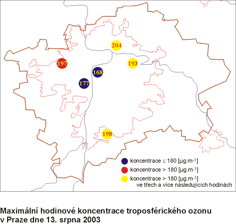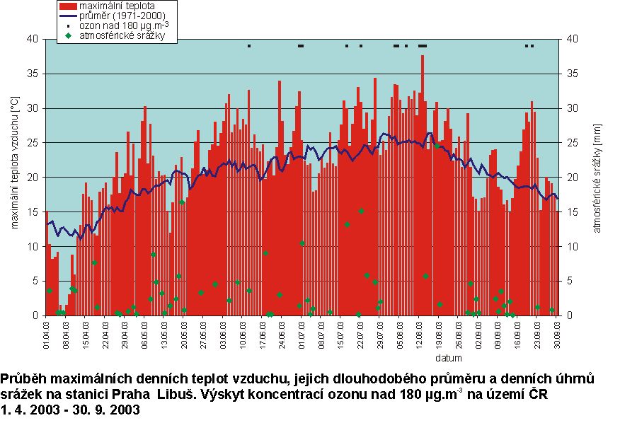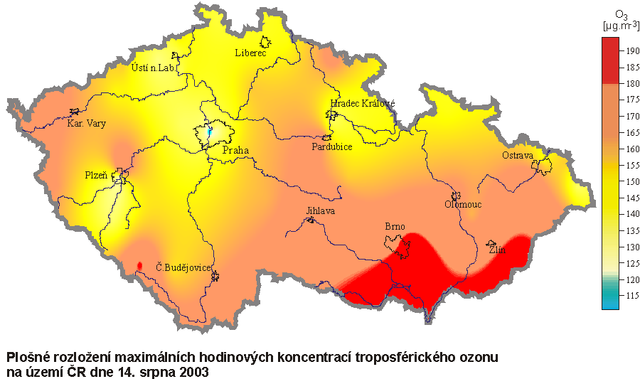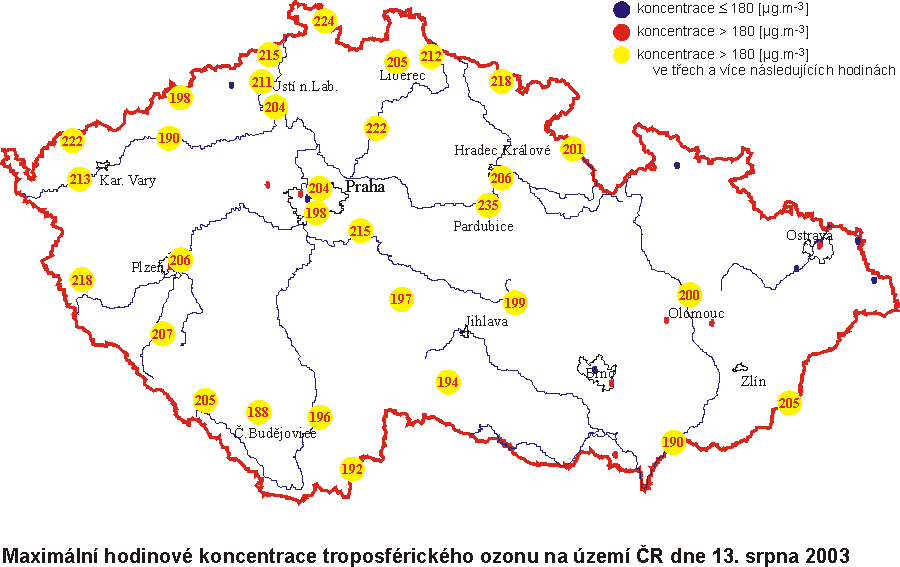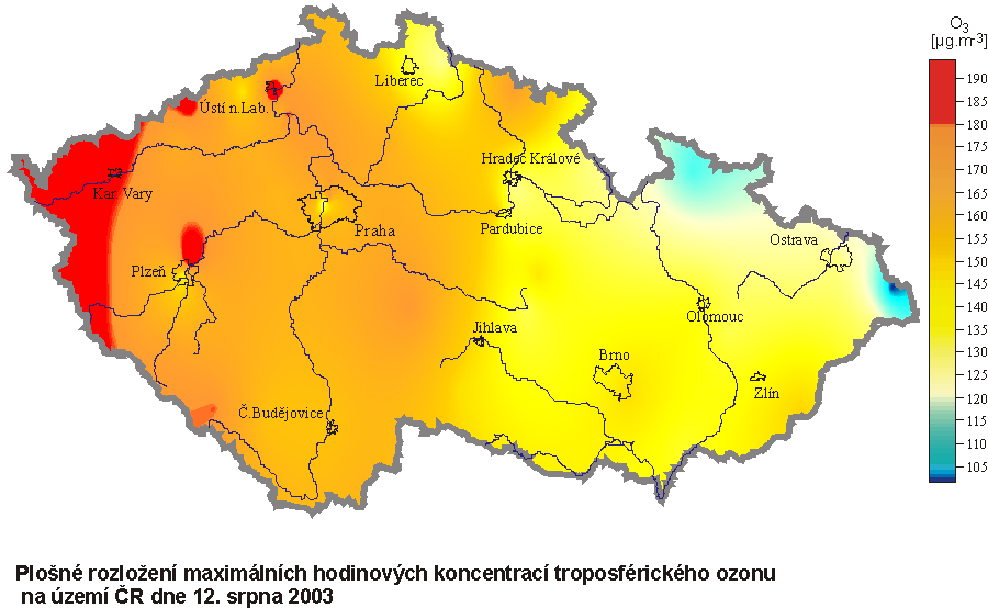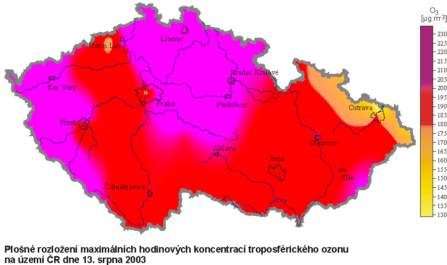 Nejvýraznější epizoda vysokých koncentrací troposférického ozonu se vyskytla ve dnech 12.–14. srpna 2003. Tlaková výše 1020 hPa se středem nad jižním Maďarskem se během sledovaného období přesunula přes severní Itálii nad jižní Španělsko a umožnila přemístění frontální zóny ze severní do střední Evropy. V týlu této výše proudil nejprve do západní, uprostřed období i do střední Evropy od jihu velmi teplý vzduch. Koncem období pronikly od severozápadu nad naše území postupně dvě studené fronty a došlo k výměně vzduchové hmoty. Dne 12. srpna bylo na celém území ČR převážně polojasno s neměřitelným množstvím srážek. Maximální teploty v Čechách vystoupily na 36 °C, na Moravě na 32 °C. Následující den bylo polojasno, přechodně oblačno, v pozdních odpoledních a nočních hodinách oblačno až zataženo s přeháňkami a bouřkami. Množství srážek bylo velice rozdílné, od neměřitelných do 11 mm, přičemž vyšší úhrny byly na severu, nižší na jihu. Maximální teploty vystoupily na 36–39,5 °C. 14. srpna bylo polojasno až oblačno s množstvím srážek v Čechách do 13 mm, na Moravě do 17 mm. Maximální teploty v Čechách vystoupily na 33 °C, na Moravě na 36 °C. Uvnitř velmi teplé vzduchové hmoty, postupující přes naše území od západu směrem na východ (obr. 2.3.2) vystoupily 12. srpna 2003 maximální hodnoty troposférického ozonu nad 180 μg.m-3 nejdříve pouze v západní polovině Čech (obr. 2.3.3, obr. 2.3.4, obr. 2.3.5), 13. srpna 2003 skoro na celém území ČR s výjimkou Ostravska, frekventovaných míst v Praze, dále Plzně, Brna, Teplic a Jeseníku. Přibližně na polovině Čech a malé oblasti na jihovýchodě Moravy vystoupily maximální koncentrace nad 200 μg.m-3 s nejvyšší hodnotou 235 μg.m-3 v Pardubicích (obr. 2.3.6, obr. 2.3.7, obr. 2.3.8). 14. srpna 2003 po přechodu dvou studených front přes Čechy a převážnou část Moravy poklesly koncentrace ozonu převážně na 140–160 μg.m-3, nad 180 μg.m-3 vystoupily pouze na jihovýchodní Moravě a na Churáňově (obr. 2.3.9, obr. 2.3.10, obr. 2.3.11). Ještě výraznější epizody s koncentracemi přízemního ozonu nad 300 μg.m-3 v téže době zasáhly západní Evropu, zejména Francii a Německo. Obr. 2.3.1 Průběh maximálních denních teplot vzduchu, jejich dlouhodobého průměru a denních úhrnů srážek na stanici Praha-Libuš. Výskyt koncentrací ozonu nad 180 μg.m-3 na území ČR 1. 4. 2003– 30. 9. 2003 Obr. 2.3.2 Maximální hodinové koncentrace troposférického ozonu na území ČR dne 12. srpna 2003 Obr. 2.3.3 Plošné rozložení maximálních hodinových koncentrací troposférického ozonu na území ČR dne 12. srpna 2003 Obr. 2.3.4 Maximální hodinové koncentrace troposférického ozonu v Praze dne 12. srpna 2003 Obr. 2.3.5 Maximální hodinové koncentrace troposférického ozonu na území ČR dne 13. srpna 2003 Obr. 2.3.6 Plošné rozložení maximálních hodinových koncentrací troposférického ozonu na území ČR dne 13. srpna 2003 Obr. 2.3.7 Maximální hodinové koncentrace troposférického ozonu v Praze dne 13. srpna 2003 Obr. 2.3.8 Maximální hodinové koncentrace troposférického ozonu na území ČR dne 14. srpna 2003 Obr. 2.3.9 Plošné rozložení maximálních hodinových koncentrací troposférického ozonu na území ČR dne 14. srpna 2003 Obr. 2.3.10 Maximální hodinové koncentrace troposférického ozonu v Praze dne 14. srpna 2003 Obr. 2.3.11 Analýza teploty vzduchu v hladině 850 hPa v období od 10.–15. srpna 2003