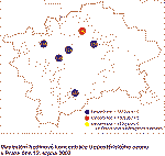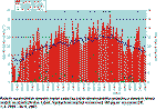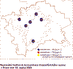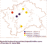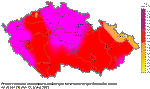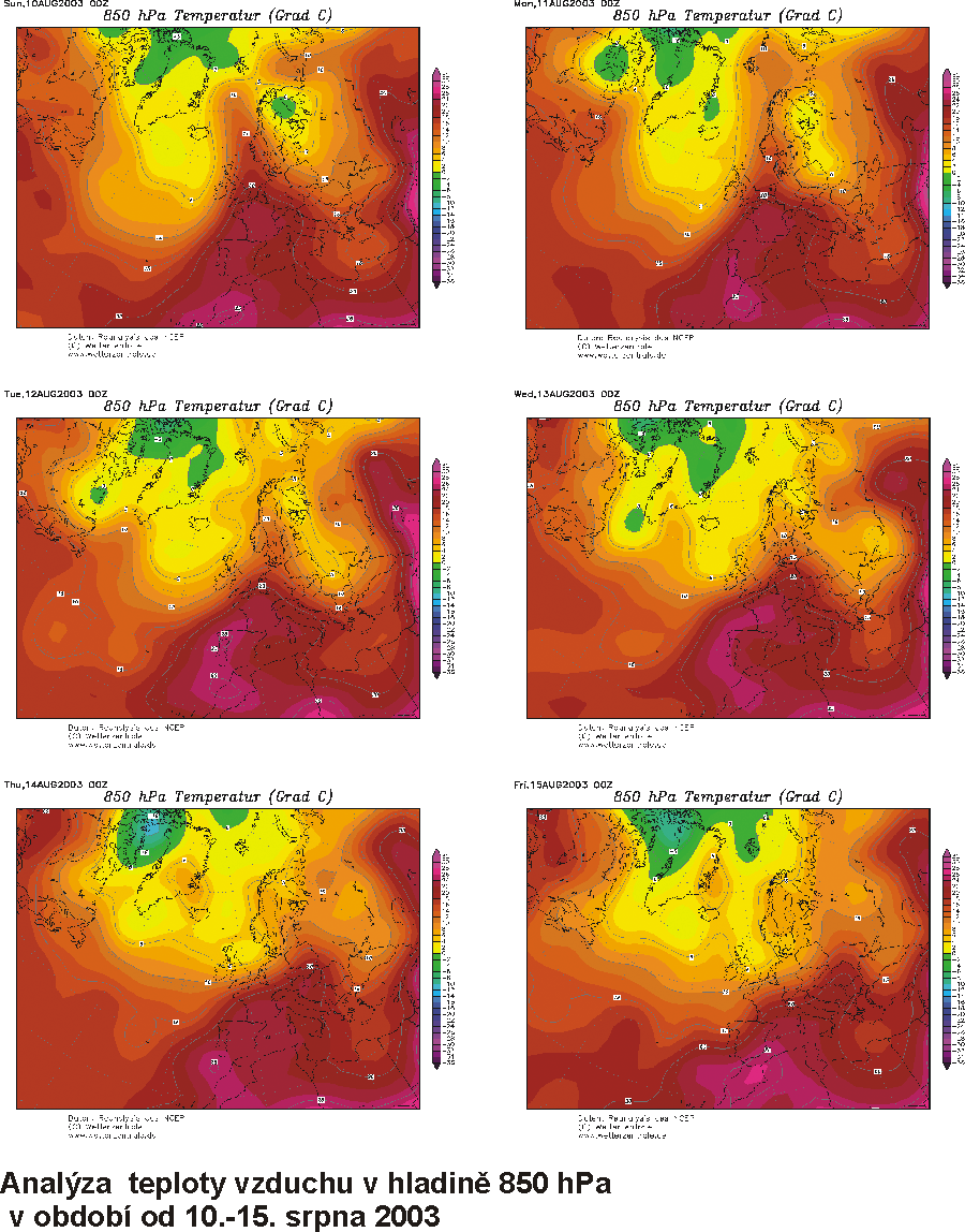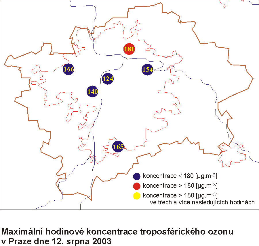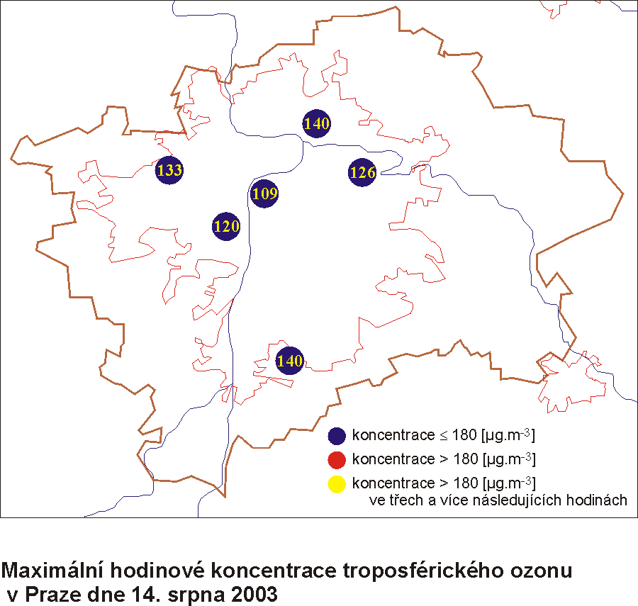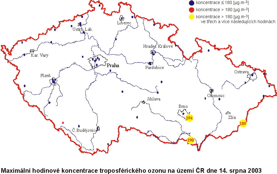 Nejvýraznější epizoda vysokých koncentrací troposférického ozonu se vyskytla ve dnech 12.–14. srpna 2003. Tlaková výše 1020 hPa se středem nad jižním Maďarskem se během sledovaného období přesunula přes severní Itálii nad jižní Španělsko a umožnila přemístění frontální zóny ze severní do střední Evropy. V týlu této výše proudil nejprve do západní, uprostřed období i do střední Evropy od jihu velmi teplý vzduch. Koncem období pronikly od severozápadu nad naše území postupně dvě studené fronty a došlo k výměně vzduchové hmoty. Dne 12. srpna bylo na celém území ČR převážně polojasno s neměřitelným množstvím srážek. Maximální teploty v Čechách vystoupily na 36 °C, na Moravě na 32 °C. Následující den bylo polojasno, přechodně oblačno, v pozdních odpoledních a nočních hodinách oblačno až zataženo s přeháňkami a bouřkami. Množství srážek bylo velice rozdílné, od neměřitelných do 11 mm, přičemž vyšší úhrny byly na severu, nižší na jihu. Maximální teploty vystoupily na 36–39,5 °C. 14. srpna bylo polojasno až oblačno s množstvím srážek v Čechách do 13 mm, na Moravě do 17 mm. Maximální teploty v Čechách vystoupily na 33 °C, na Moravě na 36 °C. Uvnitř velmi teplé vzduchové hmoty, postupující přes naše území od západu směrem na východ (obr. 2.3.2) vystoupily 12. srpna 2003 maximální hodnoty troposférického ozonu nad 180 μg.m-3 nejdříve pouze v západní polovině Čech (obr. 2.3.3, obr. 2.3.4, obr. 2.3.5), 13. srpna 2003 skoro na celém území ČR s výjimkou Ostravska, frekventovaných míst v Praze, dále Plzně, Brna, Teplic a Jeseníku. Přibližně na polovině Čech a malé oblasti na jihovýchodě Moravy vystoupily maximální koncentrace nad 200 μg.m-3 s nejvyšší hodnotou 235 μg.m-3 v Pardubicích (obr. 2.3.6, obr. 2.3.7, obr. 2.3.8). 14. srpna 2003 po přechodu dvou studených front přes Čechy a převážnou část Moravy poklesly koncentrace ozonu převážně na 140–160 μg.m-3, nad 180 μg.m-3 vystoupily pouze na jihovýchodní Moravě a na Churáňově (obr. 2.3.9, obr. 2.3.10, obr. 2.3.11). Ještě výraznější epizody s koncentracemi přízemního ozonu nad 300 μg.m-3 v téže době zasáhly západní Evropu, zejména Francii a Německo. Obr. 2.3.1 Průběh maximálních denních teplot vzduchu, jejich dlouhodobého průměru a denních úhrnů srážek na stanici Praha-Libuš. Výskyt koncentrací ozonu nad 180 μg.m-3 na území ČR 1. 4. 2003– 30. 9. 2003 Obr. 2.3.2 Maximální hodinové koncentrace troposférického ozonu na území ČR dne 12. srpna 2003 Obr. 2.3.3 Plošné rozložení maximálních hodinových koncentrací troposférického ozonu na území ČR dne 12. srpna 2003 Obr. 2.3.4 Maximální hodinové koncentrace troposférického ozonu v Praze dne 12. srpna 2003 Obr. 2.3.5 Maximální hodinové koncentrace troposférického ozonu na území ČR dne 13. srpna 2003 Obr. 2.3.6 Plošné rozložení maximálních hodinových koncentrací troposférického ozonu na území ČR dne 13. srpna 2003 Obr. 2.3.7 Maximální hodinové koncentrace troposférického ozonu v Praze dne 13. srpna 2003 Obr. 2.3.8 Maximální hodinové koncentrace troposférického ozonu na území ČR dne 14. srpna 2003 Obr. 2.3.9 Plošné rozložení maximálních hodinových koncentrací troposférického ozonu na území ČR dne 14. srpna 2003 Obr. 2.3.10 Maximální hodinové koncentrace troposférického ozonu v Praze dne 14. srpna 2003 Obr. 2.3.11 Analýza teploty vzduchu v hladině 850 hPa v období od 10.–15. srpna 2003