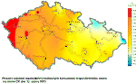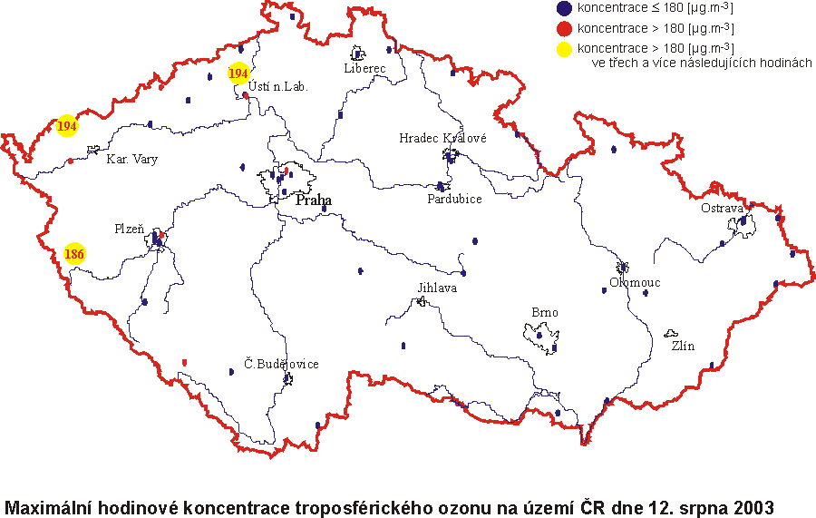 roce 2003 Zima na přelomu let 2002 a 2003 byla, posuzováno z hlediska teplot a srážek, výrazně rozkolísaná a jako celek teplotně slabě podnormální. Zatímco měsíc únor 2003 byl teplotně mírně podnormální s maximální odchylkou –3,0 °C od normálu, leden a březen byly teplotně mírně nadnormální. Leden 2003 byl srážkově slabě až mírně nadnormální, zatímco úhrny srážek v únoru a březnu 2003 byly výrazně podprůměrné a poklesly na 33 a 38 % normálu. V lednu bylo na horách 60–100 cm sněhu, v únoru a březnu na hřebenech 30–90 cm. Zimní období na přelomu roku 2003 a 2004 bylo z hlediska teplot mírně nadnormální, z hlediska srážek kolem normálu. Významně teplotně nadnormální byl měsíc listopad 2003 s průměrnou měsíční teplotou 4,8 °C. Úhrn srážek byl v listopadu 2003 významně podprůměrný s hodnotou 22 mm, představující 45 % normálu, prosinec 2003 byl srážkově nadnormální. Pro atmosférickou cirkulaci v lednu byla typická přibližně stejná četnost výskytu cyklonálních i anticyklonálních situací, v únoru a v březnu jednoznačně převažovaly typy anticyklonální. V měsících listopad a prosinec 2003 trvalo anticyklonální počasí 61–63 % doby. Zimní období 2002–2003 bylo přelomové s ohledem na skutečnost, že v ČR vstoupily v platnost nové zákonné předpisy, upravující ochranu ovzduší a provozování smogových regulačních systémů. Zrušovací ustanovení zákona č. 86/2002 Sb. (Zákon o ochraně ovzduší) mimo jiné ukončila platnost vyhlášky č. 41/1992 Sb. Tato vyhláška, upravující fungování smogových regulačních systémů, byla nahrazena vyhláškou č. 553/2002 Sb. Tímto novým předpisem byly především radikálně upraveny zvláštní imisní limity, při jejichž překročení se vyhlašuje vznik smogové situace, a byl změněn seznam stacionárních zdrojů, podléhajících regulaci podle ústředního regulačního řádu. Ústředním regulačním řádem budou nadále regulovány vybrané stacionární zdroje pouze na území Ústeckého a Karlovarského kraje, působnost ústředního regulačního řádu skončila v oblasti Ostravska. Zvláštní imisní limity jsou podle nové právní úpravy vyhlášeny pro oxid siřičitý, oxid dusičitý a troposférický ozon. Imisní koncentrace oxidu siřičitého nepředstavují v současné době problém a v souladu s dřívějším hodnocením dlouhodobých trendů počtu dnů s vyhlášením signálů v SRS lze očekávat, že žádná regulace zdrojů z důvodů vysokých koncentrací SO2 vyhlášena nebude. Rovněž přechod od sumy oxidů dusíku k hodnocení podle oxidu dusičitého bude mít, jak rovněž předpovídala dřívější hodnocení provozu SVRS, za následek velmi nízkou pravděpodobnost naplnění podmínek pro vyhlášení signálu. Hodinové průměry koncentrace NO2 se na počátku roku 2003 pohybovaly pod úrovní zvláštních imisních limitů. Nejvyšší koncentrace NO2 se vesměs vyskytovaly na konci února, kdy počasí nad naším územím ovlivňovala řídící tlaková výše se středem nad Skandinávií, později nad východní Evropou. Po celou dobu se vyskytovaly inverze teploty vzduchu, slabé proudění vzduchu a převládaly špatné rozptylové podmínky. Meteorologické situace podobného charakteru, které podmínily zhoršení kvality ovzduší, se vyskytly rovněž na začátku druhé dekády v prosinci, kdy naše území ovlivňovala oblast vyššího tlaku vzduchu. I když meteorologické situace, při nichž byly zaznamenány nepříznivé rozptylové podmínky, které podmiňují akumulaci znečišťujících látek v blízkosti zemského povrchu, byly potenciálně nebezpečné z hlediska možného vzniku smogové situace, k vyhlášení žádných signálů v rámci SVRS v průběhu hodnoceného období nedošlo, protože nikde v oblasti Ústeckého a Karlovarského kraje nebyly splněny podmínky pro jejich vyhlášení. Je zřejmé, že klesající trend počtu vyhlášených signálů dále pokračuje. Pokud nedojde k hromadnému návratu obyvatelstva k využívaní pevných paliv v domácnostech, lze očekávat trvání tohoto příznivého stavu i v příštích letech. Určité potenciální ohrožení představuje zejména doprava, produkující zvýšené koncentrace oxidu dusičitého, především ve větších městech. Nicméně i tam byly případy překročení zvláštních imisních limitů pro upozornění u oxidu dusičitého sporadické a nevyskytovaly se v souvislých epizodách. Pro oxid siřičitý nebyl zvláštní imisní limit pro upozornění překročen vůbec. V příštích letech bude tudíž třeba soustředit pozornost zejména na troposférický ozon, pro nějž jsou vydávány signály v rámci ústředního regulačního řádu v letním období. Ozon je typickou sekundární znečišťující látkou, která se v atmosféře tvoří působením slunečního záření na oxidy dusíku za přítomnosti těkavých organických látek. Výchozí látky vstupující do složitých chemických reakcí, během nichž troposférický ozon vzniká, se označují jako prekurzory. Více než 50 % prekurzorů ozonu tvoří imise, pocházející z automobilového provozu. Optimální meteorologické podmínky pro vznik troposférického ozonu – intenzivní sluneční záření, vysoká teplota vzduchu a bezvětří nebo malé rychlosti větru – se vyskytují při anticyklonálních situacích v letním období. V období od 1.4. do 30.9.2003 byly anticyklonální a cyklonální situace, určující charakter počasí na území ČR, rovnoměrně zastoupeny. Nejméně anticyklonálních situací, celkově v 8 dnech, bylo v červenci. Naproti tomu největší počet, celkově v 25 dnech, se vyskytl v srpnu, kdy v nepřetržité řadě od 3. do 27. srpna se střídaly pouze situace anticyklonálního typu 
