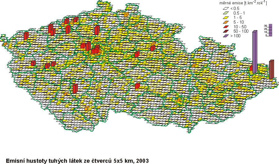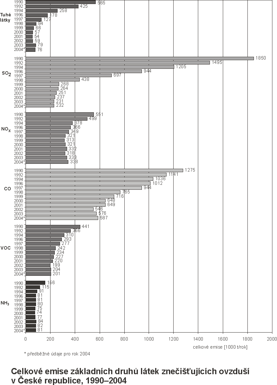 Tab. 1.1 Celkové emise hlavních znečišťujících látek v roce 2004 – předběžné údaje Tab. 1.2 Celkové emise skleníkových plynů v letech 1990–2003 [Mt CO2ekv.] Tab. 1.3 Celkové emise těžkých kovů a POPs v letech 1990–2003 Tab. 1.4 Spotřeba paliv zdrojů REZZO 1, 1990–2003 Tab. 1.5 Měrné emise ze stacionárních zdrojů, 1990 Tab. 1.6 Měrné emise ze stacionárních zdrojů, 2003 Obr. 1.1 Celkové emise základních druhů látek znečišťujících ovzduší v České republice, 1990–2004 Obr. 1.2 Spotřeba paliv zdrojů REZZO 3, 1992–2004 Obr. 1.3 Změna skladby vytápění bytů v r. 2004 oproti r. 1991 Obr. 1.4 Emisní hustoty tuhých látek ze čtverců 5x5 km, 2003 Obr. 1.5 Emisní hustoty oxidu siřičitého ze čtverců 5x5 km, 2003 Obr. 1.6 Emisní hustoty oxidů dusíku ze čtverců 5x5 km, 2003 Obr. 1.7 Emisní hustoty CO ze čtverců 5x5 km, 2003