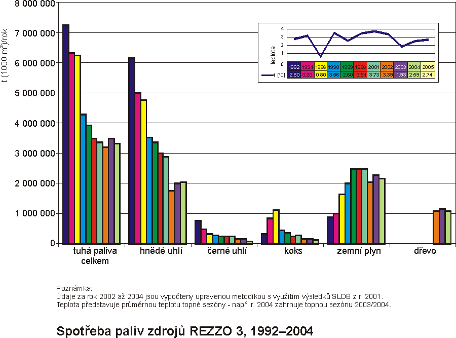 V souladu s legislativou platnou od roku 2002 jsou zdroje znečišťování ovzduší rozděleny pro potřeby emisní bilance do jednotlivých kategorií. Podle tohoto rozdělení jsou v rámci Informačního systému kvality ovzduší (ISKO) provozovaného ČHMÚ zavedeny databáze Registru emisí a zdrojů znečišťování ovzduší (REZZO), které slouží k archivaci a prezentaci údajů o stacionárních a mobilních zdrojích znečišťování ovzduší. Zvláště velké, velké a střední zdroje znečišťování ovzduší jsou sledovány jako bodové zdroje jednotlivě, malé zdroje plošně na úrovni obcí, mobilní zdroje liniově (silniční doprava na úsecích zahrnutých do sčítání dopravy) a plošně na úrovni okresů (ostatní mobilní zdroje). I. Zvláště velké a velké zdroje znečišťování – REZZO 1 Výchozím podkladem bilance emisí látek znečišťujících ovzduší zvláště velkých a velkých zdrojů za rok 2004 (cca 3500 provozoven) jsou údaje souhrnné provozní evidence, předané provozovateli zdrojů České inspekci životního prostředí (ČIŽP), která zajišťuje jejich sběr a verifikaci dat. Zároveň se tyto údaje využívají k aktualizaci databáze REZZO 1, tj. stálých a proměnných údajů o provozu zdrojů znečišťování ovzduší (kategorizace zdrojů, parametry zařízení, spotřeba paliv, množství emisí ap.). V kategorii středních zdrojů jsou evidovány údaje o cca 30 000 zdrojích. Zpracování údajů pro emisní bilanci a databázi REZZO 2 zajišťují pracovníci úřadů obcí s rozšířenou působností (ORP). K termínu dokončení ročenky nebyly k dispozici konečné údaje o emisích zdrojů REZZO 1 a REZZO 2. Vzhledem k této okolnosti jsou údaje o emisích za rok 2004 uvedeny v tabulkách jako předběžné. V kategorii malých zdrojů jsou vypočítávány emise z lokálních topenišť. Primárními podklady pro výpočet jsou údaje ze Sčítání lidu, domů a bytů (SLDB) provedených v letech 1991 a 2001. Emisní bilance je modelově zpracovávána z aktualizovaných údajů o klimatických podmínkách, potřebách tepla pro vytápění bytů a z nich vypočtených spotřeb jednotlivých druhů paliv. Skladba paliv vychází z podkladů SLDB o převládajícím způsobu vytápění bytů a používaných druzích energií, každoročně aktualizovaných z údajů poskytnutých centrálními dodavateli paliv a energií. Bilance emisí z dopravy, která je v kompetenci Ministerstva dopravy ČR, byla zpracována CDV Brno podle metodiky stanovení emisí znečišťujících látek z dopravy. Emise z provozu zemědělských a lesních strojů a dalších mobilních prostředků byly vypočítány z údajů o prodeji a spotřebě pohonných hmot za rok 2004. Předběžné údaje o celkovém množství emisí základních znečišťujících látek v roce 2004, tj. tuhých znečišťujících látek (TZL), oxidu siřičitého (SO2), oxidů dusíku (NOx), oxidu uhelnatého (CO), těkavých organických látek (VOC) a amoniaku (NH3) a podíly jednotlivých kategorií zdrojů na celkových emisích jsou uvedeny v tab. 1.1. Podrobnější územně členěné údaje o emisích jsou uvedeny na webových stránkách ČHMÚ. Vývoj celkových emisí základních znečišťujících látek v letech 1990–2004 je uveden na obr. 1.1. Inventarizace emisí a propadů plynů ovlivňujících klimatický systém Země je prováděna v souladu s mezinárodní metodikou IPCC, která je neustále zpřesňována. Tato inventarizace bude též podkladem pro kontrolu plnění mezinárodních závazků daných Kjótským protokolem; v případě ČR se jedná o snížení celkových emisí skleníkových plynů do období 2008–2012 o 8 % vůči referenčnímu roku 1990. Pravidelným monitorováním emisí skleníkových plynů se rovněž naplňují požadavky Rozhodnutí Evropského parlamentu a Rady č. 280/2004/ES. Z důvodů neustálého vývoje metodiky a důsledného zavádění kontrolních mechanismů QA/QC dochází v případě potřeby ke zpětným přepočtům hodnot, a proto může v jednotlivých letech docházet i k drobným změnám v průběžně vykazovaných údajích. Celkové emise skleníkových plynů včetně zahrnutí jejich propadů, vyjádřené v ekvivalentních hodnotách oxidu uhličitého (CO2), poklesly v ČR z hodnoty 189,9 mil. tun v roce 1990 na 143,4 mil. tun v roce 2003 (tab. 1.2) a vůči referenčnímu roku 1990 poklesly o 24,5 %. Od roku 1995jsou rovněž zahrnuty emise HFC, PFC a SF6 (látek obsahujících fluór, tzv. F-plyny), jejichž vliv je rovněž kontrolován Kjótským protokolem. Jejich současný podíl na celkových emisích skleníkových plynů činí v České republice 1,2 %. Podíl emisí CO2 na celkových emisích byl v roce 2003 86,0 %, podíl emisí CH4 7,1 % a podíl emisí N2O 5,7 %. Uvedené podíly se v posledních letech v ČR příliš nemění. V tab. 1.3 jsou uvedeny emise těžkých kovů (TK) a persistentních organických látek (POPs). Tyto emisní bilance byly zpracovány převážně s využitím aktivitních údajů (spotřeb paliv a pohonných hmot, množství spálených odpadů, statistických údajů o produkci vybraných technologií) a příslušných emisních faktorů. Vedle emisí Pb, Hg a Cd vykazovaných do r. 2000 jsou od roku 2001 prováděny také výpočty emisí dalších sledovaných těžkých kovů. Metodika výpočtu a odhadu emisí TK a POPs byla v průběhu roku 2003 ověřována podle mezinárodně doporučených postupů a pro rok 2002 byl poprvé proveden výpočet s použitím aktualizovaných emisních faktorů. Údaje o emisích POPs za předchozí období jsou v současné době přepočítávány. Vývoj spotřeby hlavních druhů paliv zdrojů REZZO 1 v letech 1990–2003 je uveden v tab. 1.4. Výrazné snížení spotřeby hnědého uhlí a těžkého topného oleje u velkých zdrojů se podílelo na dlouh