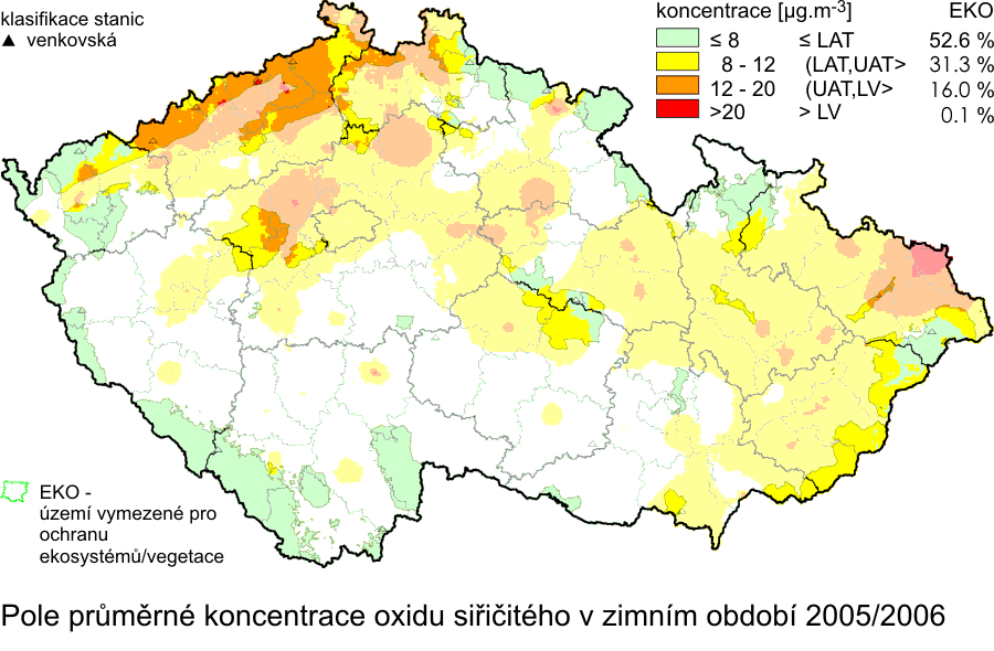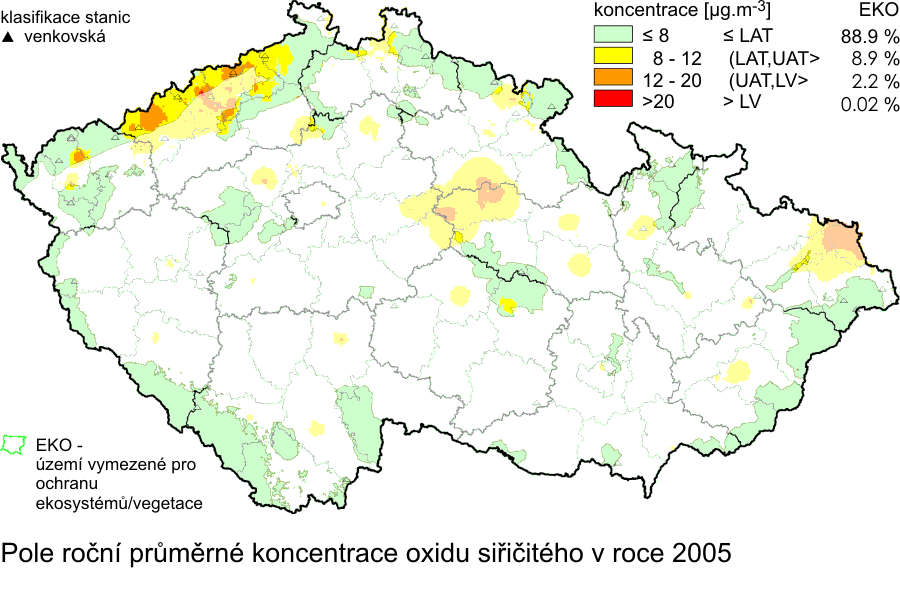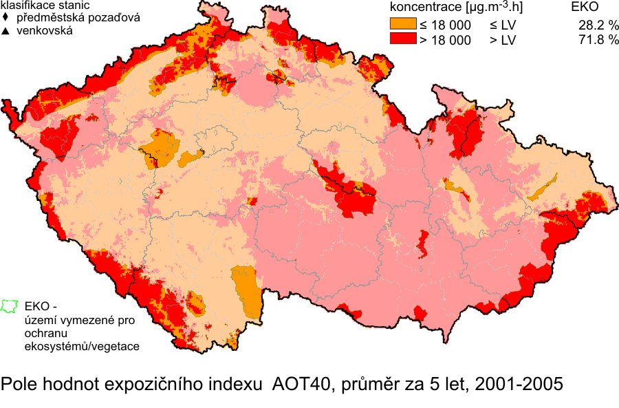 SO2 a AOT40 ozonu pro území vymezené legislativou. Je zřejmé, že na 72 % území