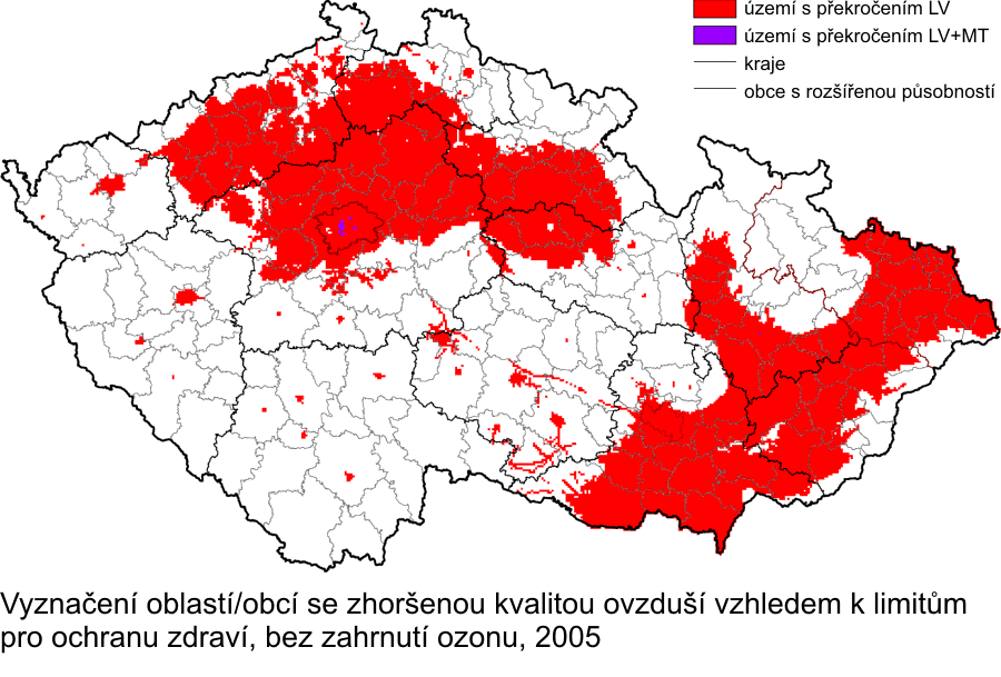 hlediska ochrany zdraví Výše popsanými postupy mapování byly připraveny mapy územního rozložení příslušných charakteristik kvality ovzduší prezentované v předchozích částech. Oblasti s hodnotami imisních charakteristik většími než příslušné imisní limity (červeně, případně fialově vyznačené oblasti) tak vymezují oblasti se zhoršenou kvalitou ovzduší. Tab. II.4.26 shrnuje seznam oblastí České republiky, kde byla podle výsledku mapování rozložení imisních charakteristik překročena v roce 2005 úroveň imisních limitů pro ochranu zdraví lidí s uvedením procent překročení příslušného území. Tab. II.4.25. pak sumarizuje za rok 2005 oblasti překročení imisních limitů zvýšených o meze tolerance pro ochranu zdraví lidí. Tabulky ukazují procenta překročení příslušných imisních limitů pro odpovídající území pro jednotlivé komponenty a imisní charakteristiky a v souhrnu jsou pak uvedeny oblasti, ve kterých je překročen alespoň jeden imisní limit některé z komponent. Procenta překročení uvedená v souhrnu v tab. II.4.26 odpovídají procentům území uvedeného administrativního celku, ve kterém je překročen aspoň jeden imisní limit z uvedeného souboru limitů pro ochranu zdraví lidí. Mapa na obr. II.4.61 znázorňuje vymezení oblastí se zhoršenou kvalitou ovzduší vzhledem k limitům pro ochranu zdraví lidí bez zahrnutí ozonu v roce 2005. Tabulka II.4.27 pak ukazuje pro rok 2005 překročení cílového imisního limitu