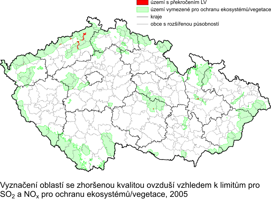 hlediska ochrany ekosystémů a vegetace Vyhodnocení překročení těchto limitů je provedeno pouze pro území vymezené pro ochranu ekosystémů a vegetace podle nařízení vlády č. 350/2002 Sb., ve znění pozdějších předpisů. Výsledné vyznačení oblastí se zhoršenou kvalitou ovzduší vzhledem k imisním limitům pro SO2 a NOx pro ochranu ekosystémů/vegetace ve smyslu zákona č. 86/2002 Sb. o ochraně ovzduší, ve znění pozdějších předpisů, pro rok 2005 ukazuje obr. II.4.63. Tab. II.4.28 ukazuje pro rok 2005 procentuálně vyjádřenou míru překročení