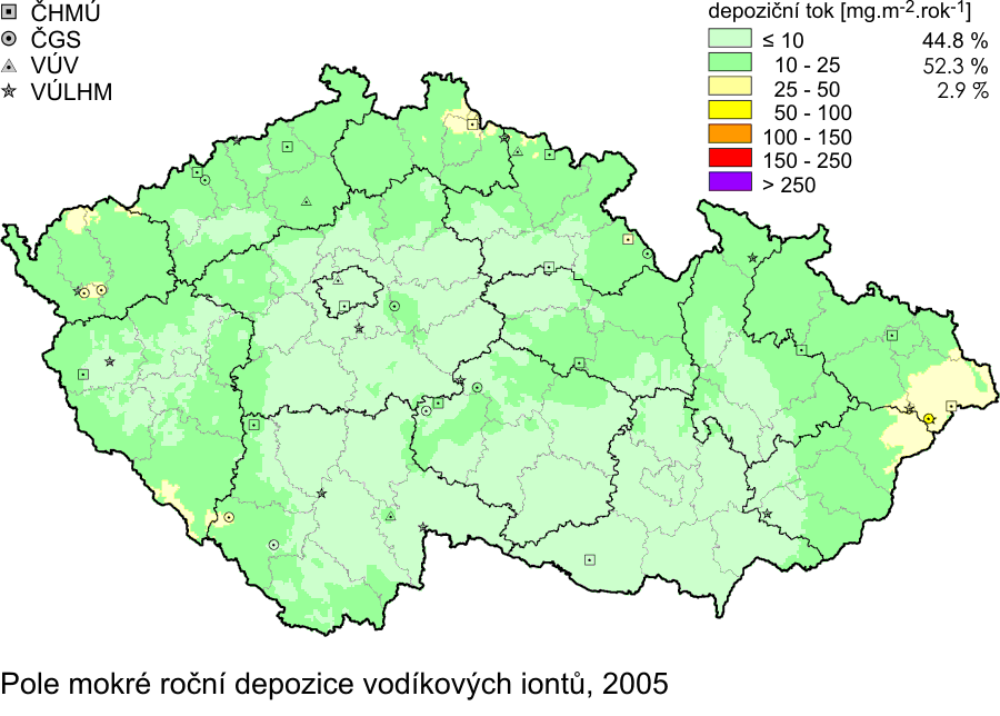 byly vytvořeny mapy depozice celkové. Mapa mokré depozice vodíkových iontů byla