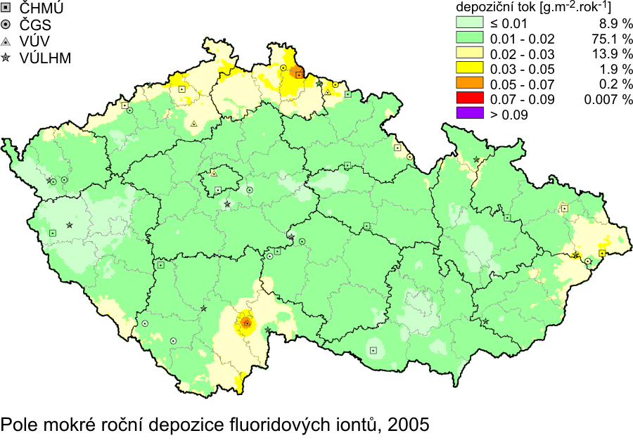 Obr. III.14 Pole mokré roční depozice fluoridových iontů, 2005