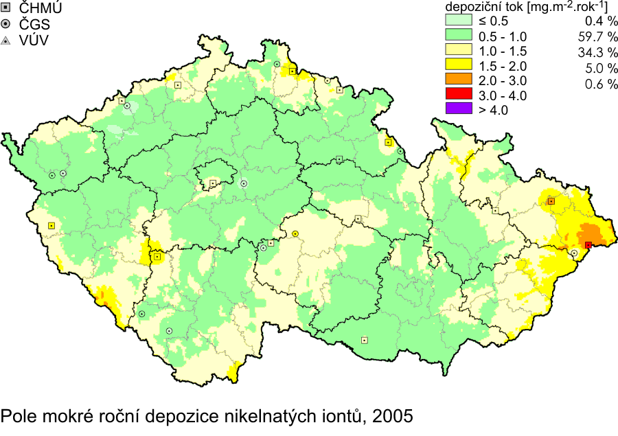 - Vzhled mapy mokré roční depozice nikelnatých iontů poukazuje na nárůst