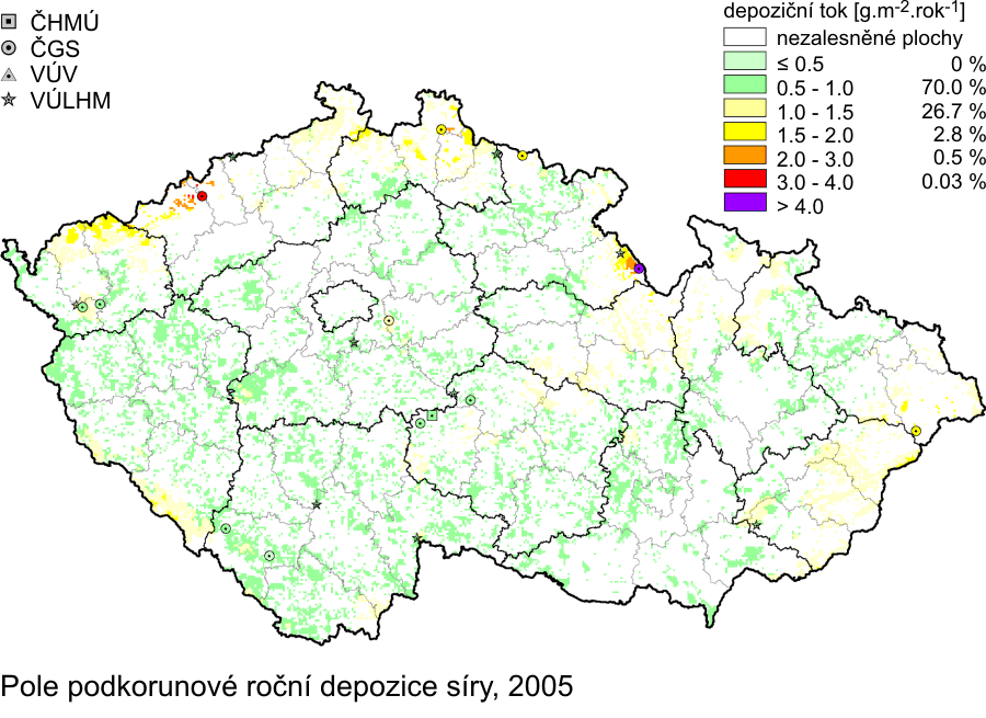 Mapové zobrazení podkorunové depozice síry bylo vytvořeno pro místa s porosty
